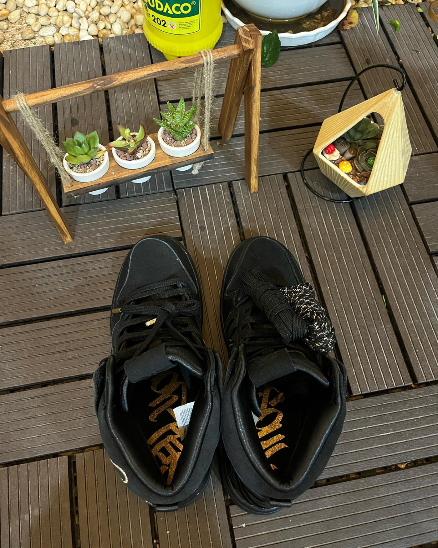 鞋帮外侧分别用金色和黑色的刺绣,勾勒出标志性的涂鸦字体。
