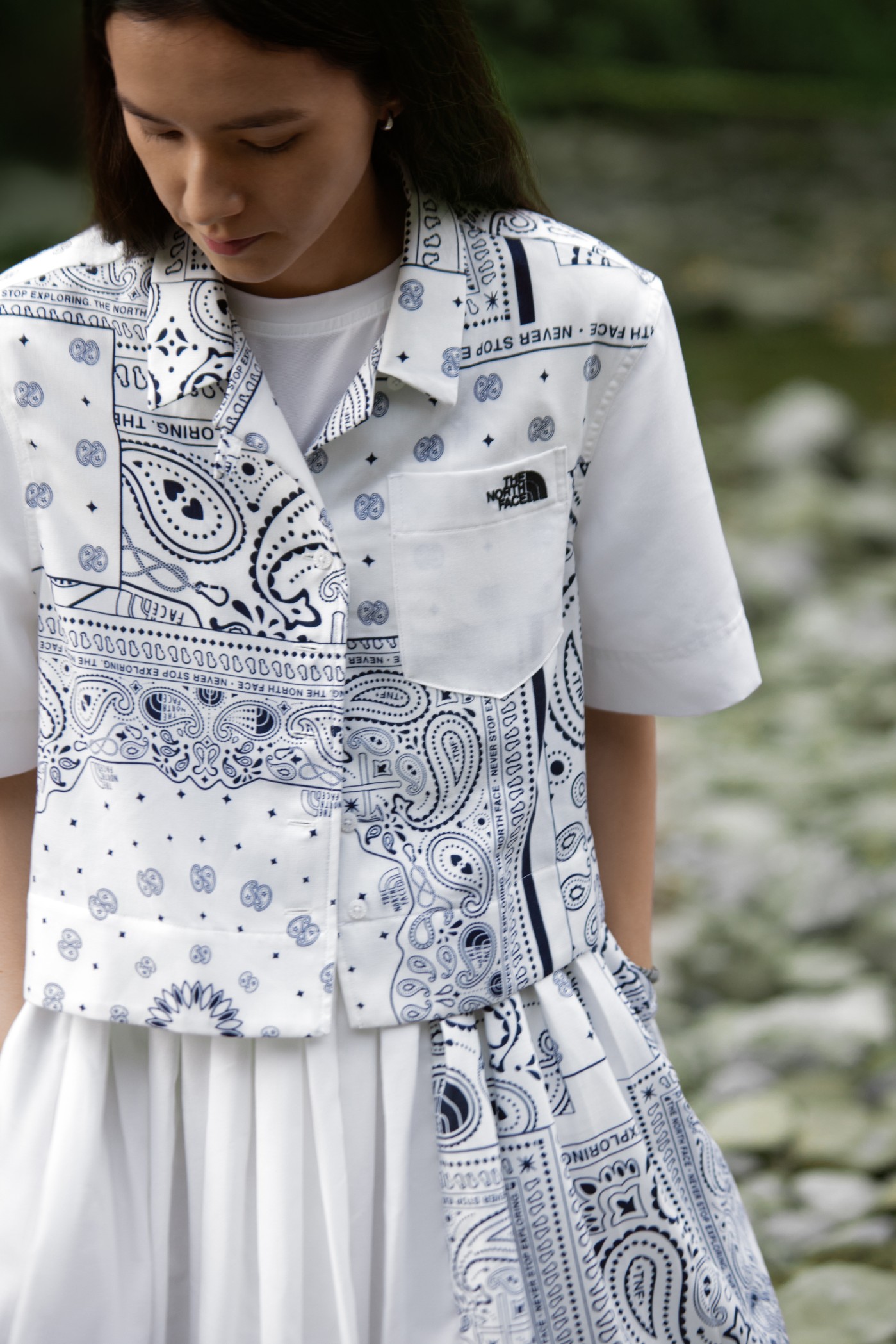 细节方面,NEVER STOP EXPLORING 字样点缀其中,搭配 The North Face 刺绣的胸前口袋,精致感满满。