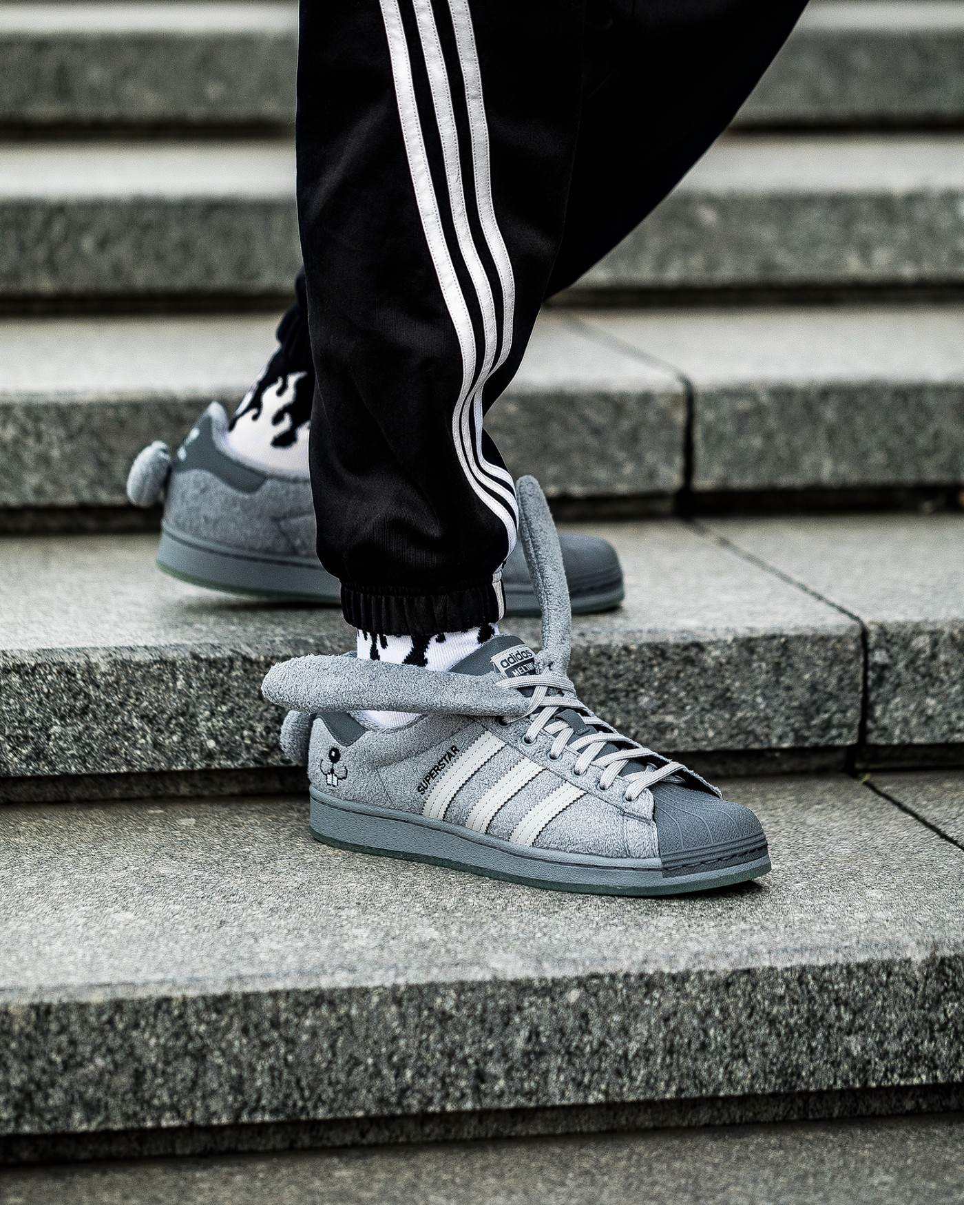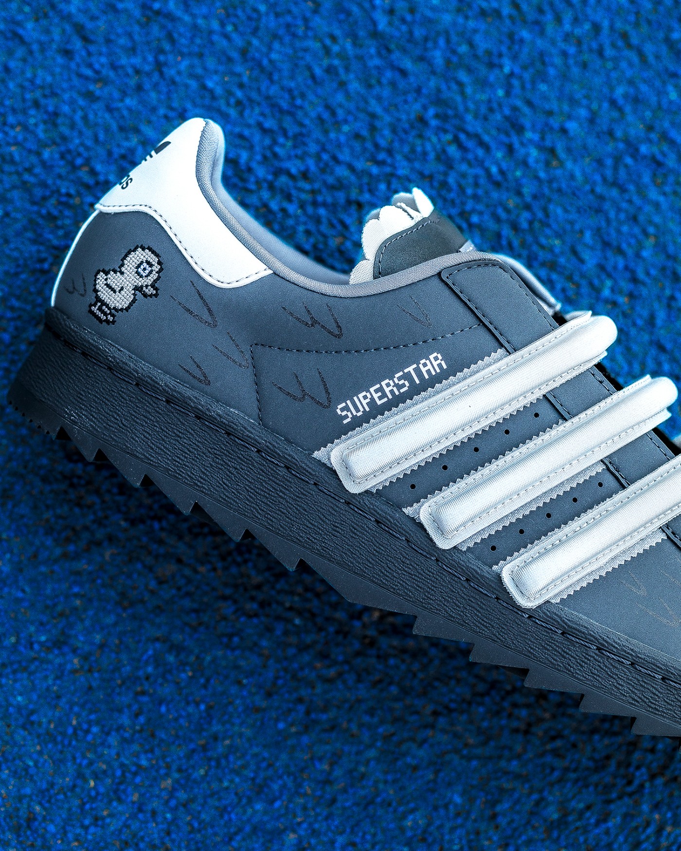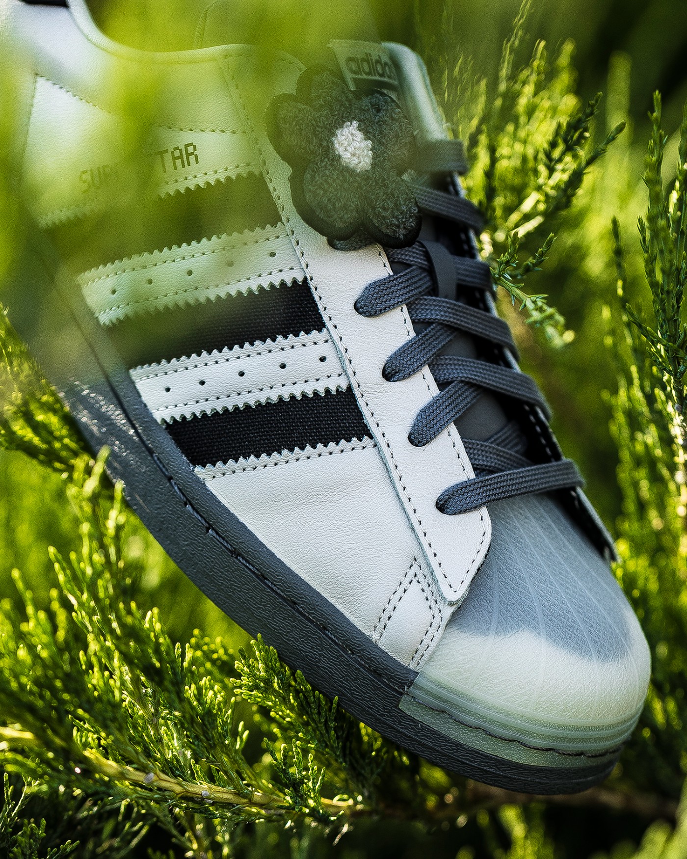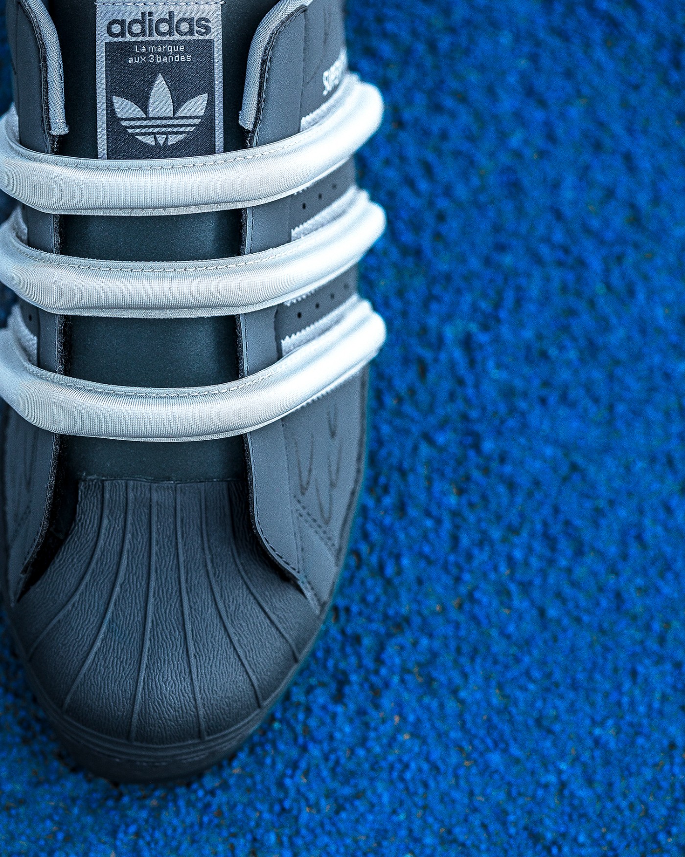 抽去所有颜色后,灰白的强烈碰撞让这双 Superstar 的鞋型改动显得更加前卫、突出。