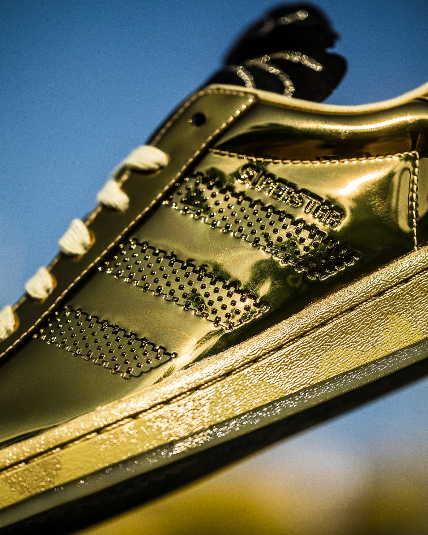 电镀质感的金色鞋面,鞋尾压印的品牌 Logo,在阳光下十分闪耀,相当奢华。
