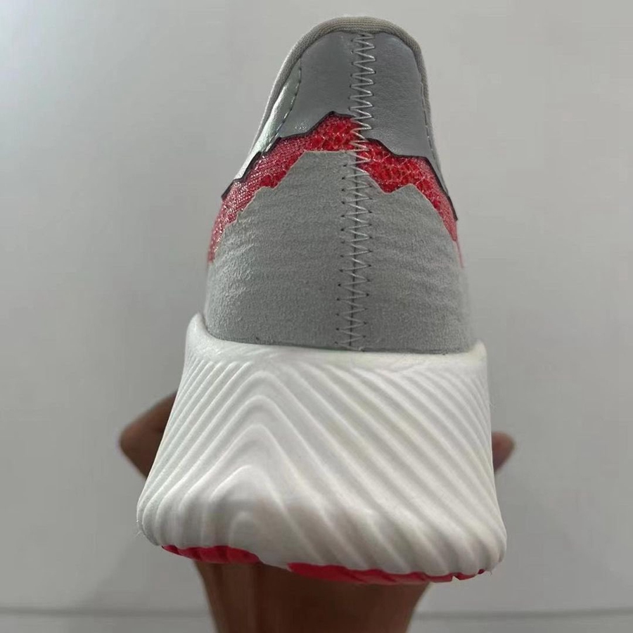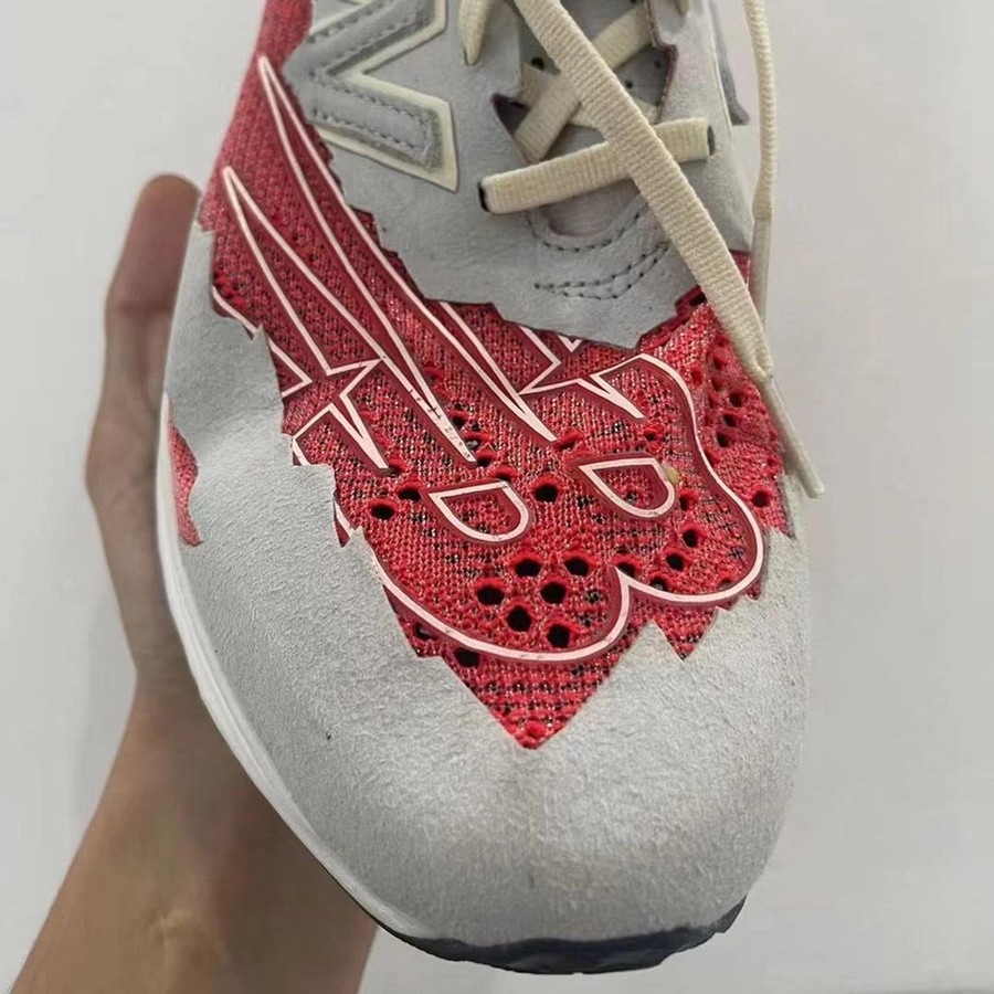 从目前释出的图片看,整体采用浅灰与鲜红共同构建,标志性的撕裂手法,将透气织物网面与鞋身麂皮材质巧妙衔接。