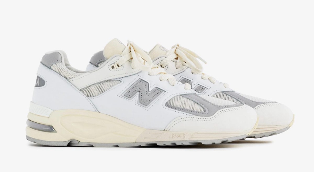 鞋舌和中底则以做旧感满满的奶油色呈现,搭配 990v2 经典的 ABZORB 中底,完成全部设计。