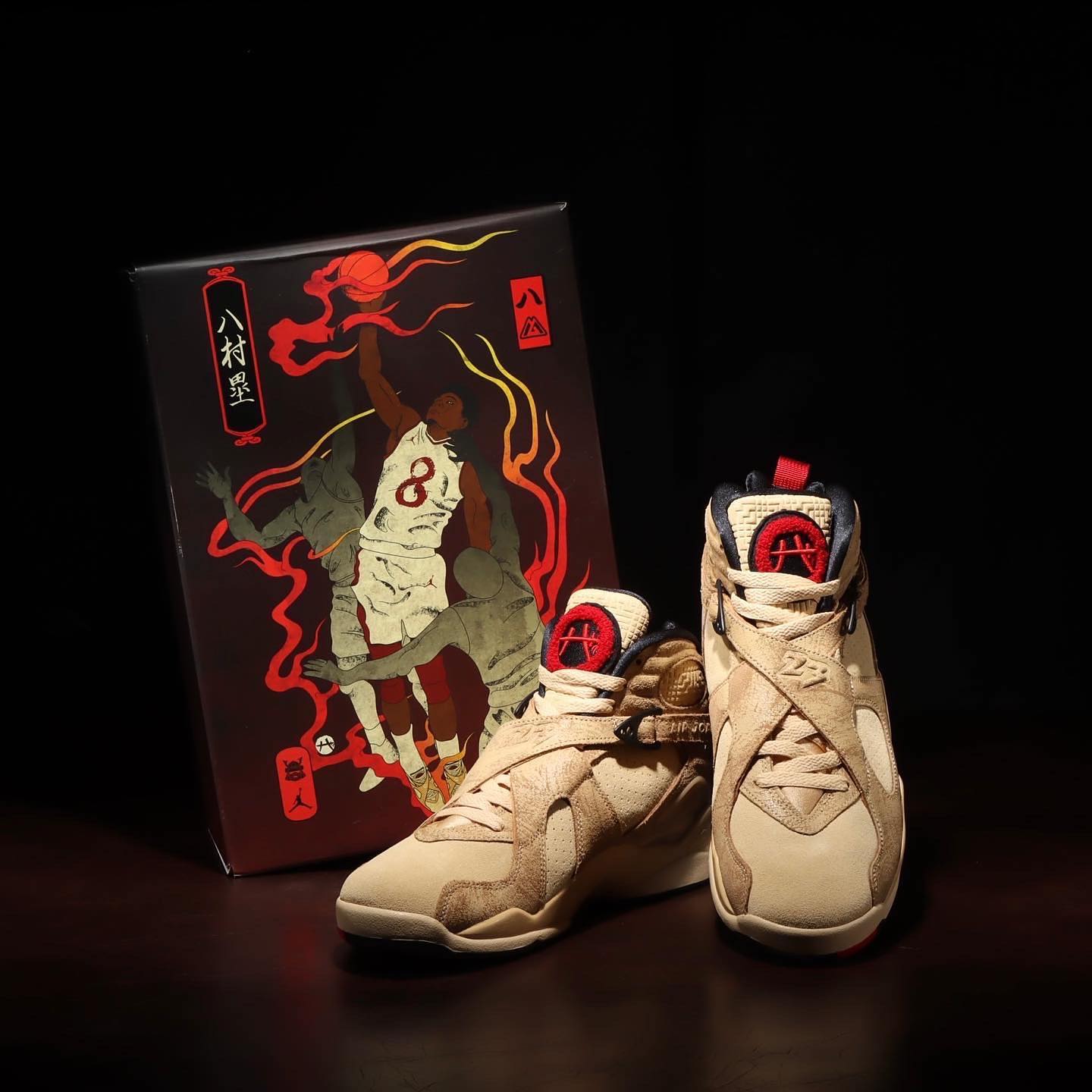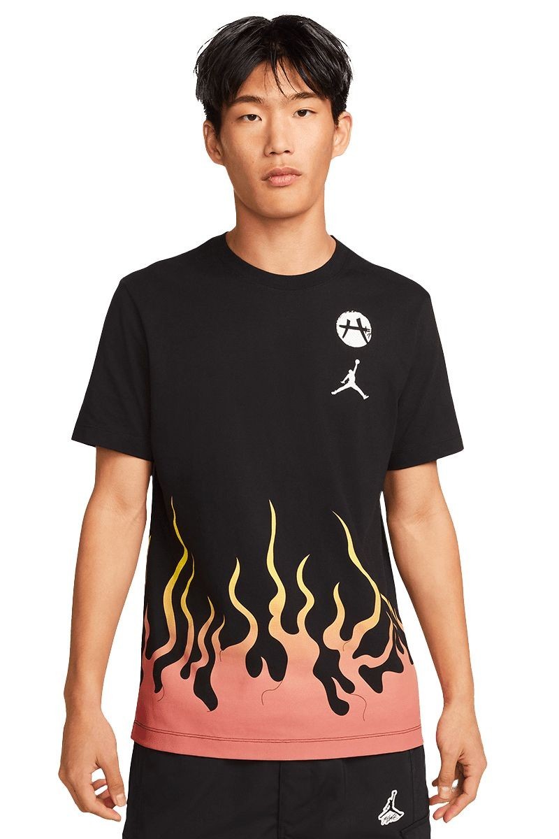 在 T 恤下摆和卫衣胸口刺绣处都加入了浮世绘风格的火焰元素,呼应同主题鞋盒上图案,也传达出对篮球的热爱。