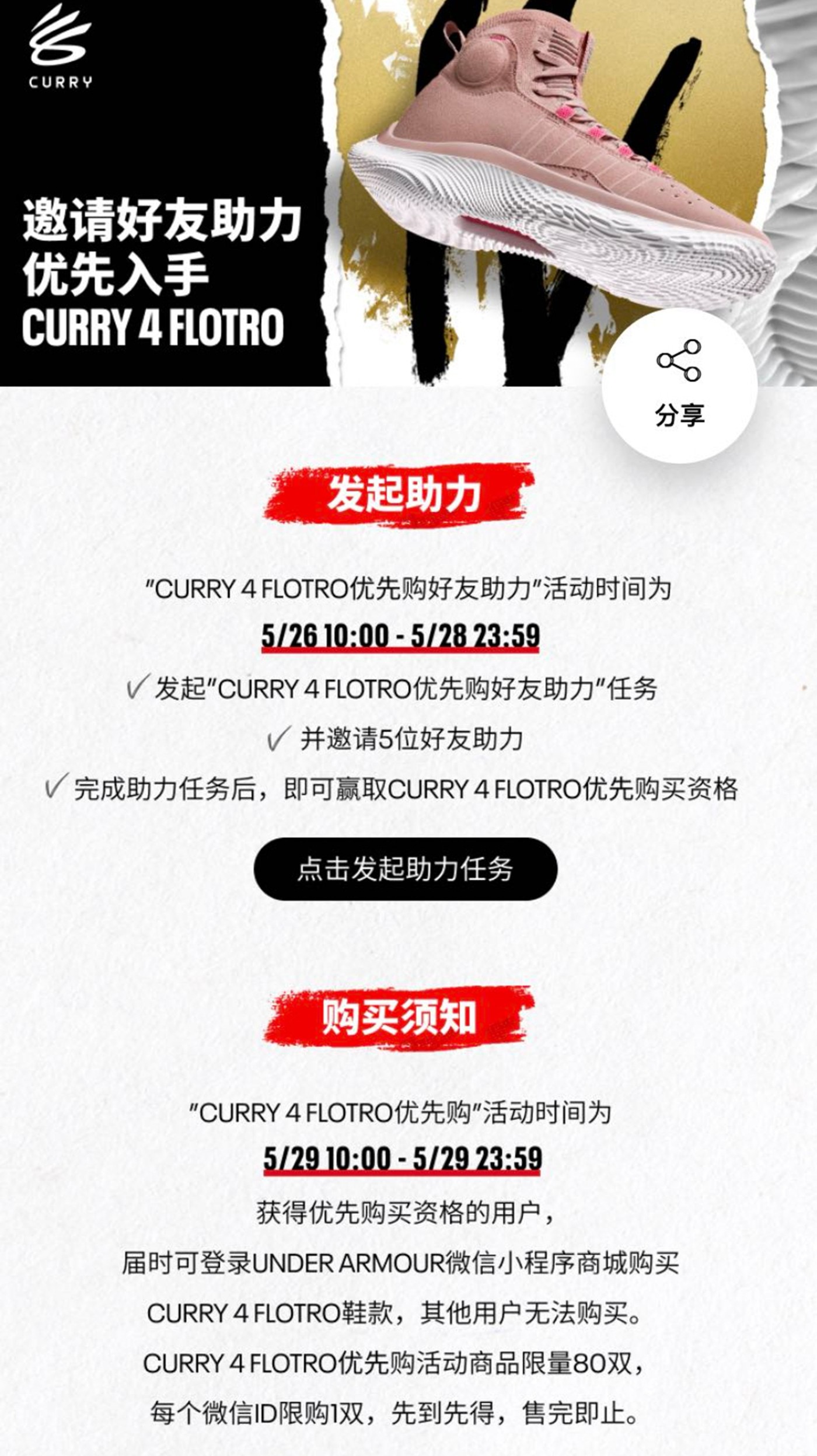 5 月 26 日早十点至 5 月 28 日晚十二点之间,发起 Curry 4 Flotro 优先购好友助力任务,并邀请 5 位好友助力,完成任务后即可获得优先购买资格,限量 80 双,先到先得。