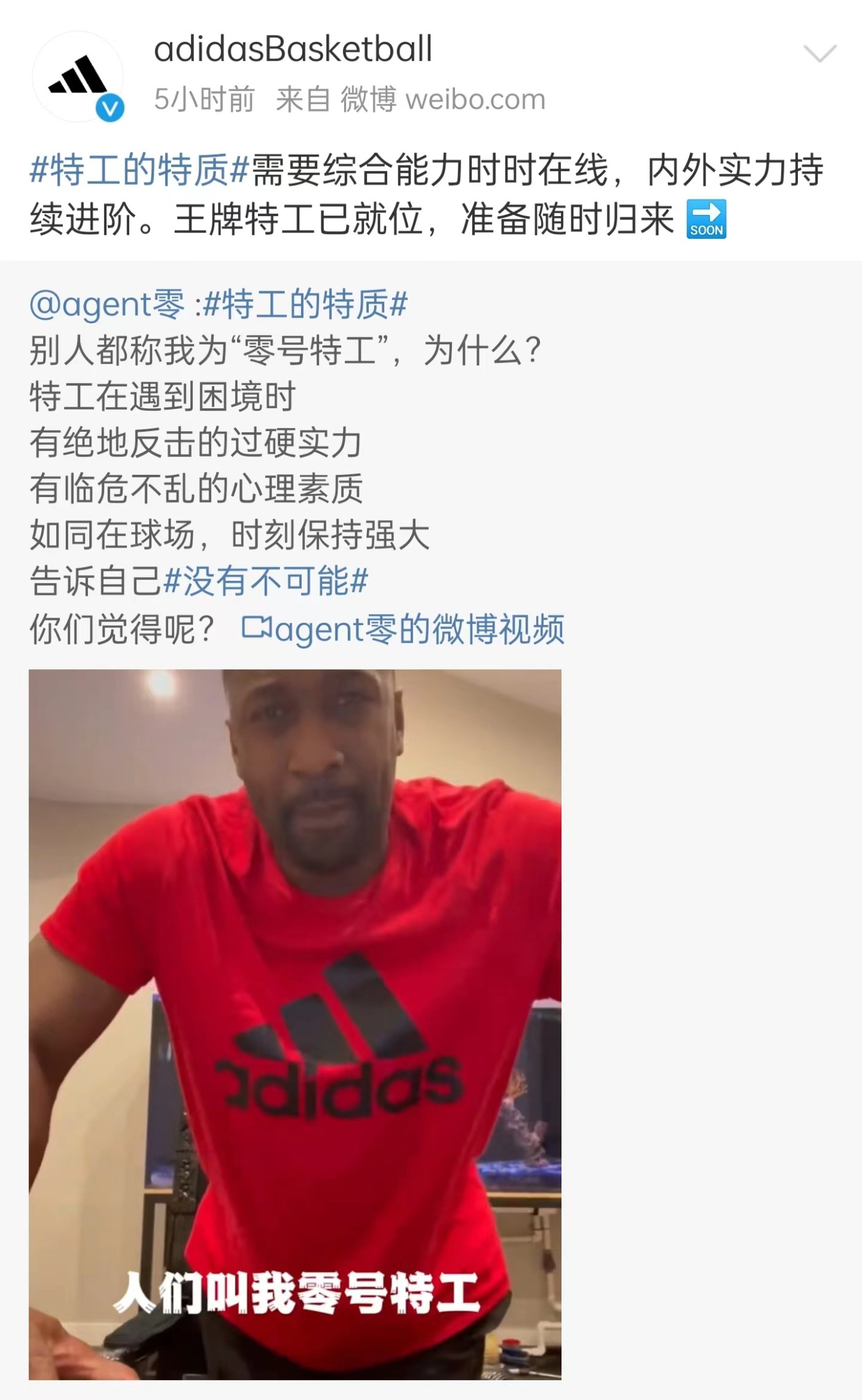 首先是阿里纳斯在微博发布视频,解读了自己「特工的特质」,并且再度说出了那句经典口号:没有不可能。