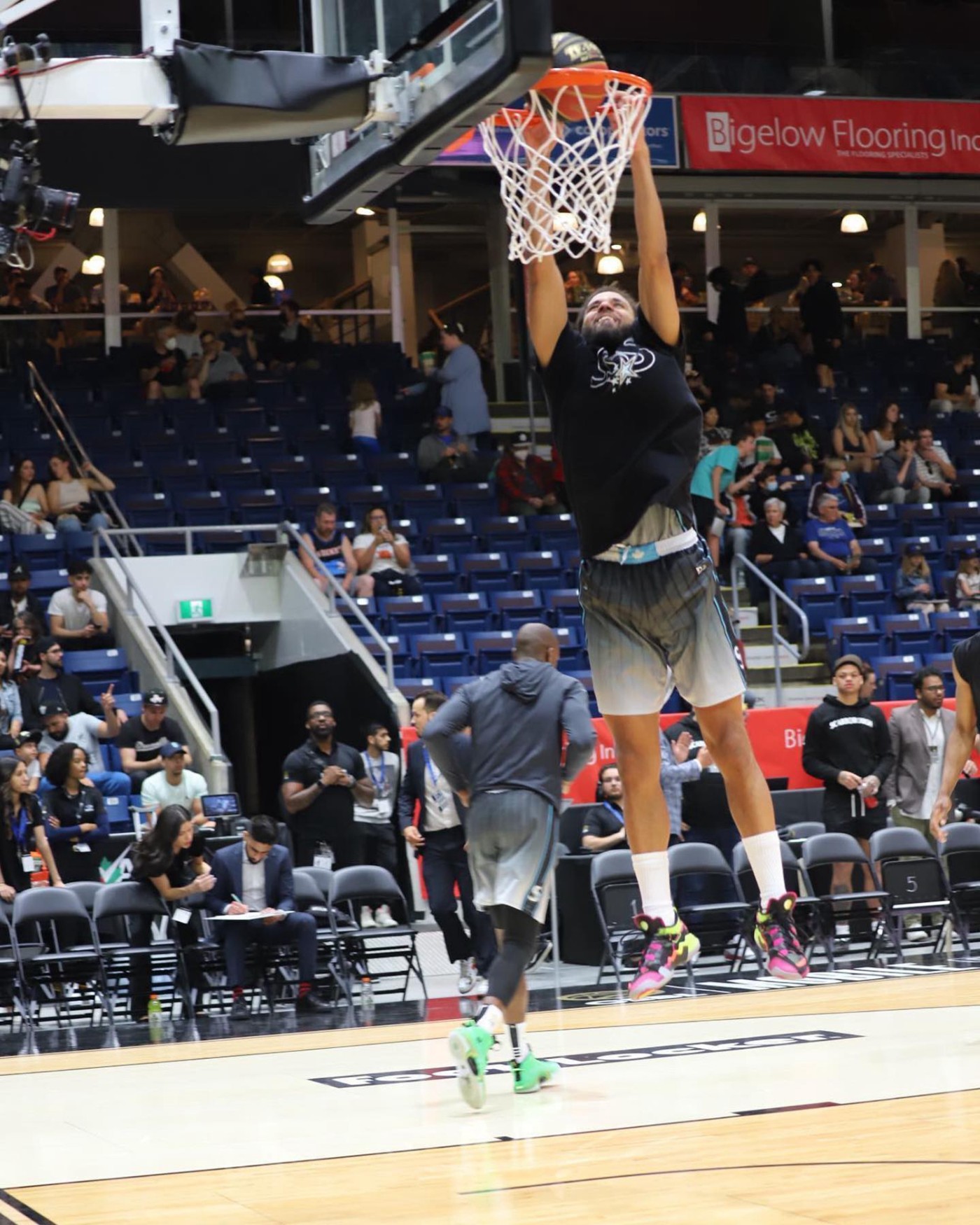 赛前热身他也秀了一次双手暴扣。