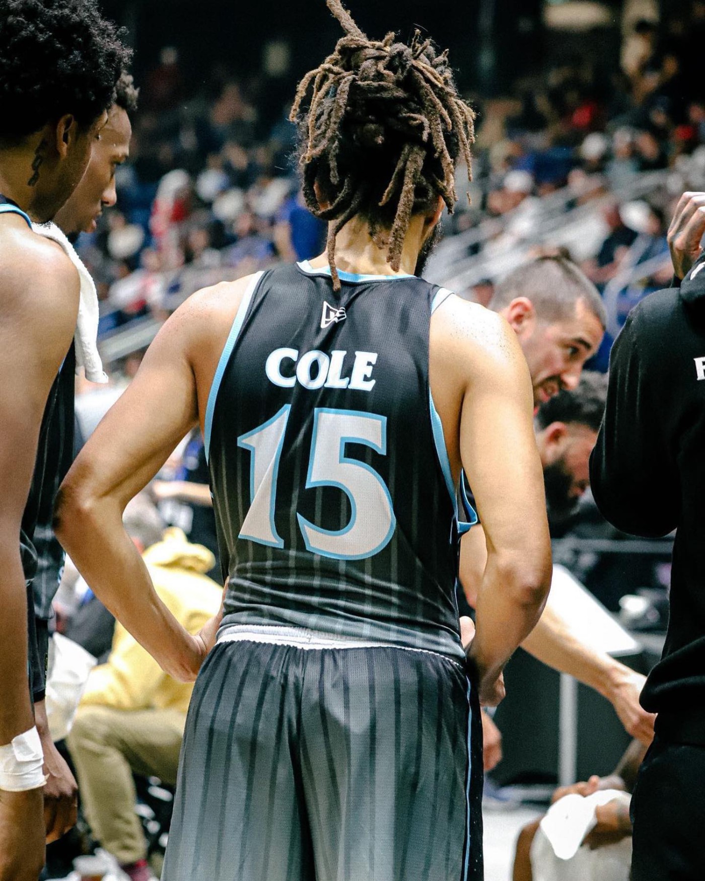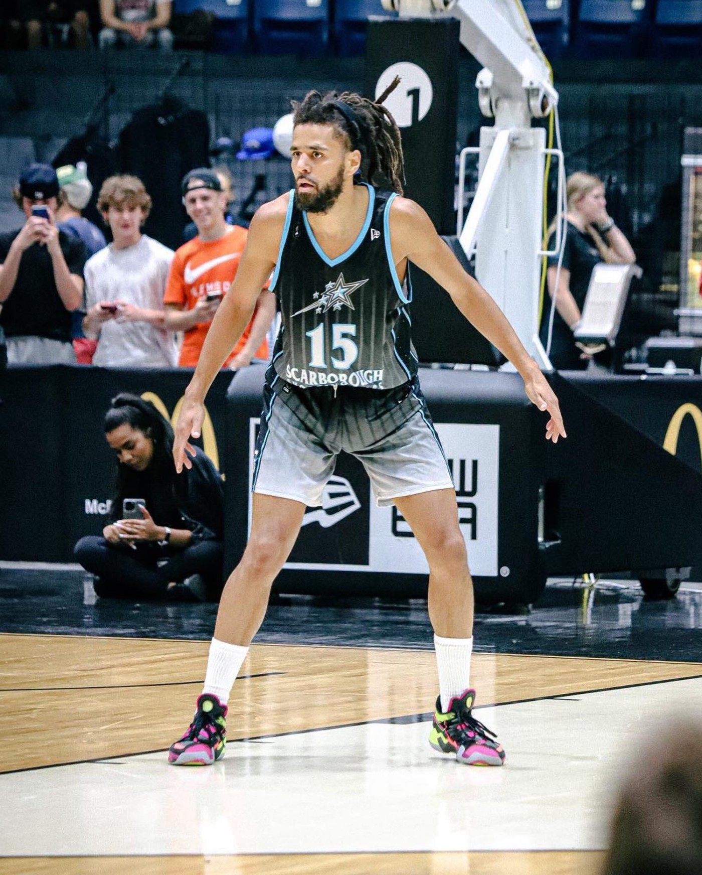可以看到 J.Cole 身披 15 号球衣征战赛场,保留着他标志性的脏辫发型。