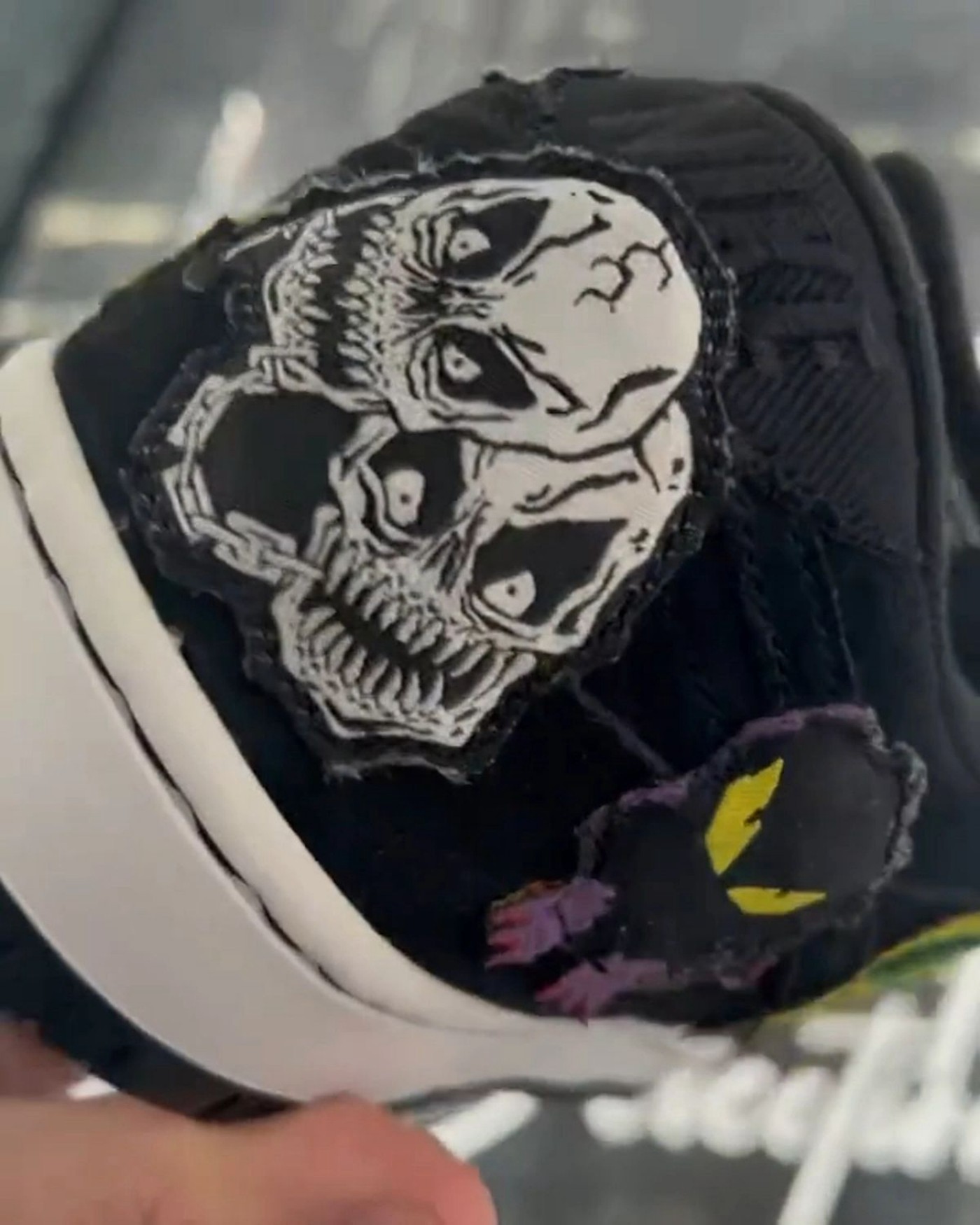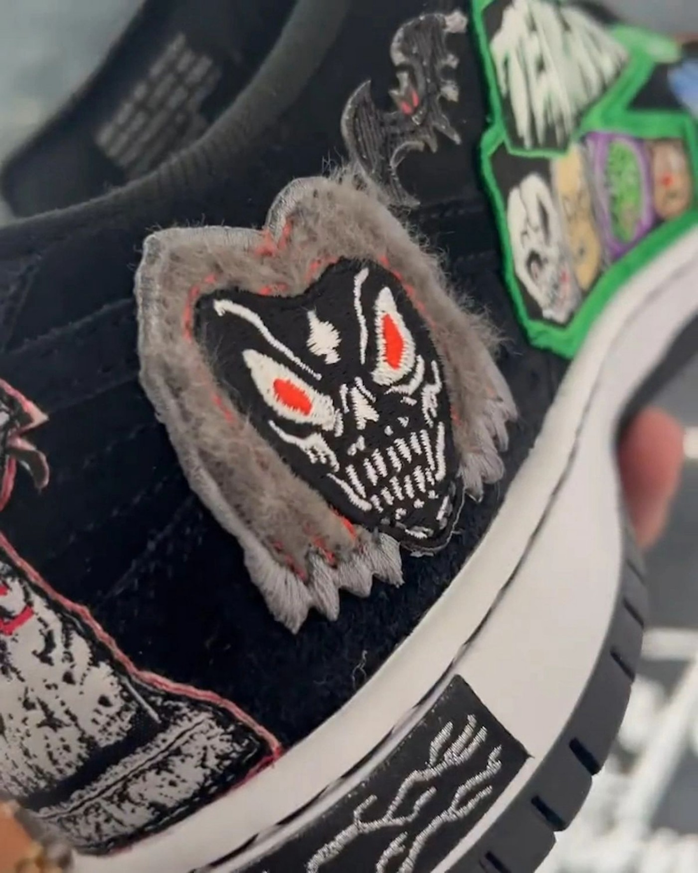 整双鞋可谓是相当惊悚了,鞋面上布满各种涂鸦画风的妖魔鬼怪。