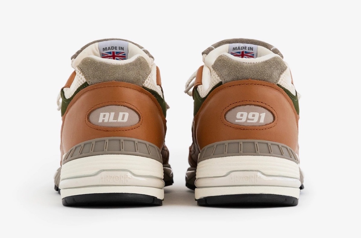 后跟处 ALD 和 991 字样,以及鞋舌内部的英国国旗标志,彰显鞋款不俗身份。