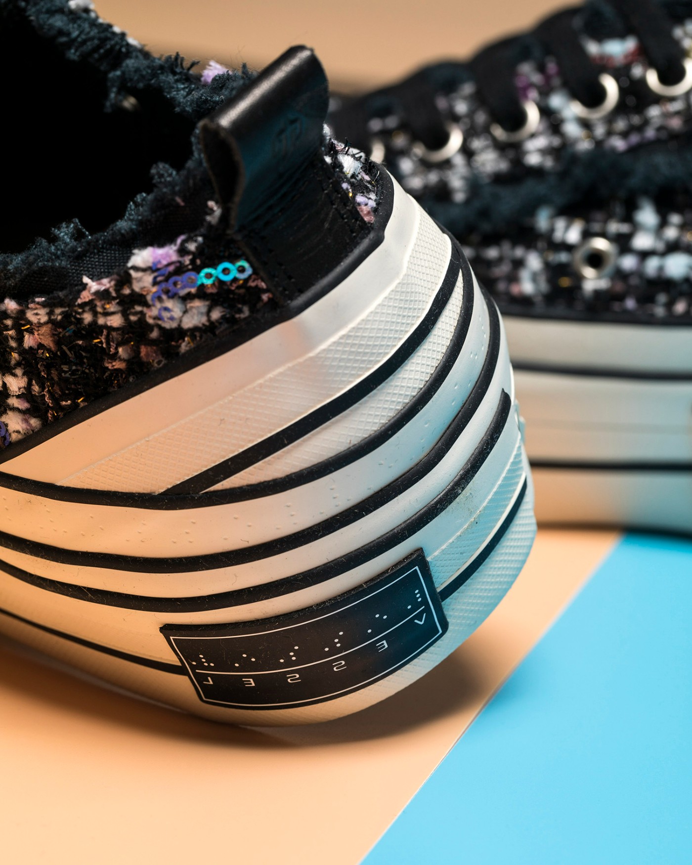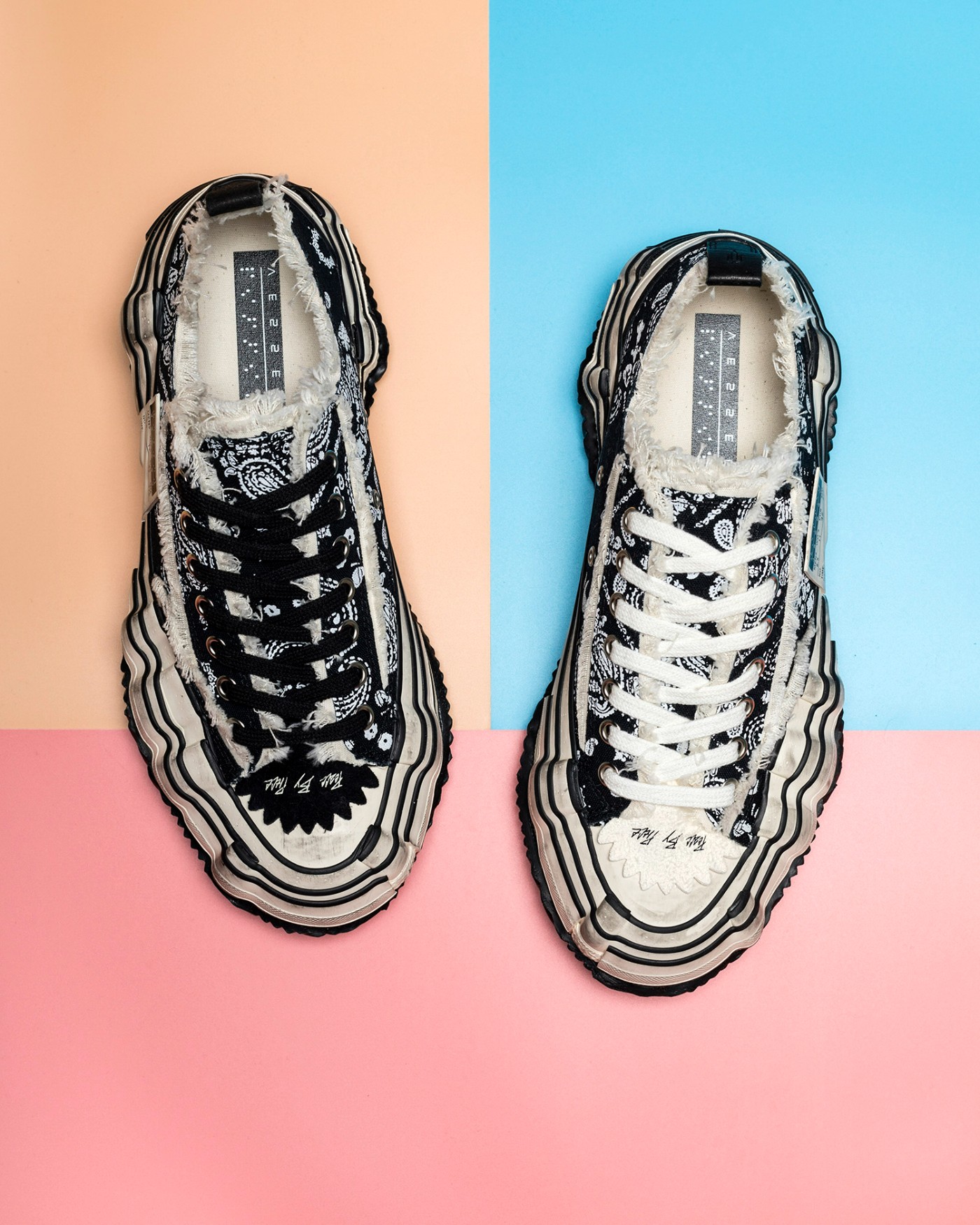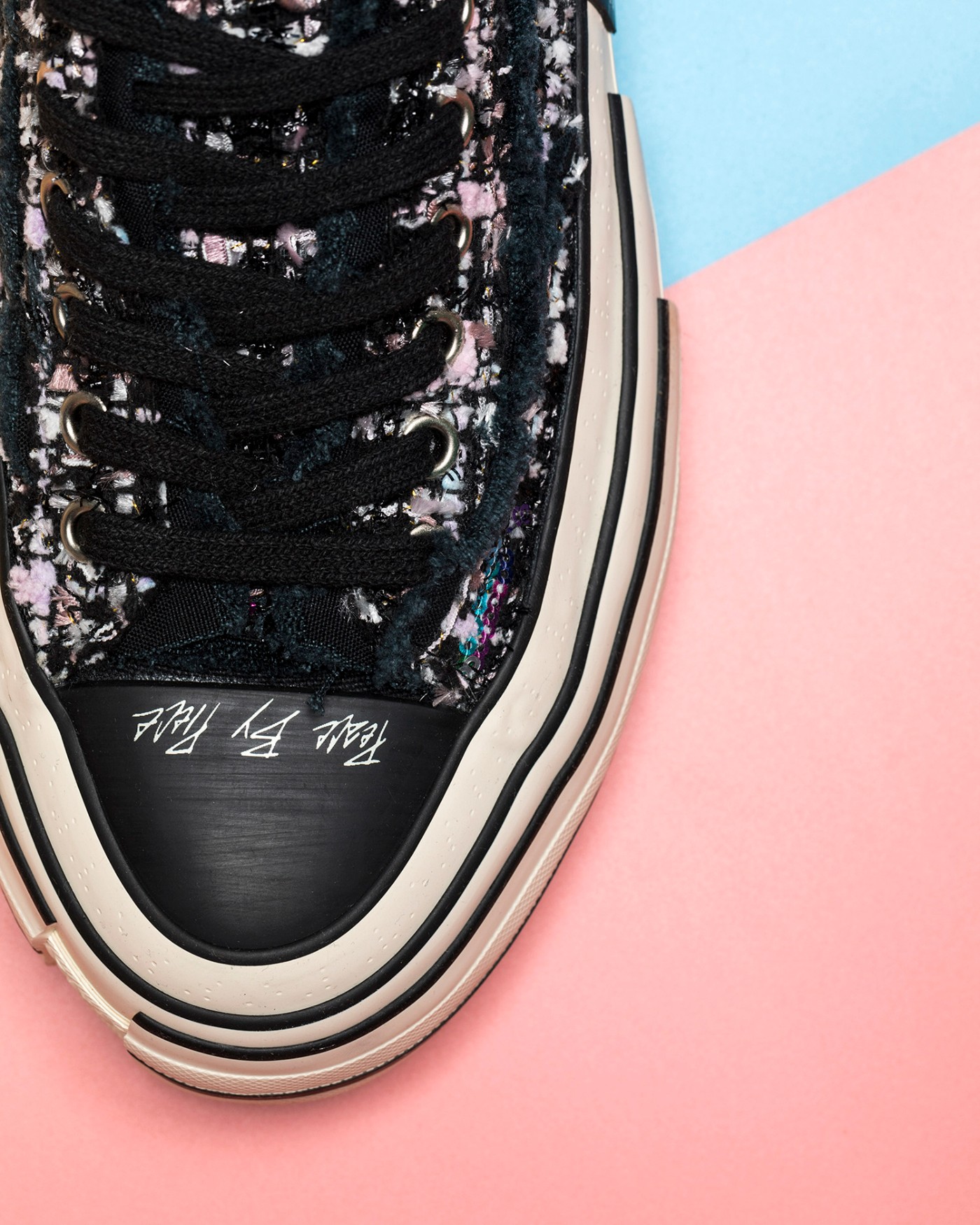 鞋面依旧是略带破坏效果的面料,但内部掺杂许多粉色、白色的细节,在黑色鞋面的衬托下像碎花一般。