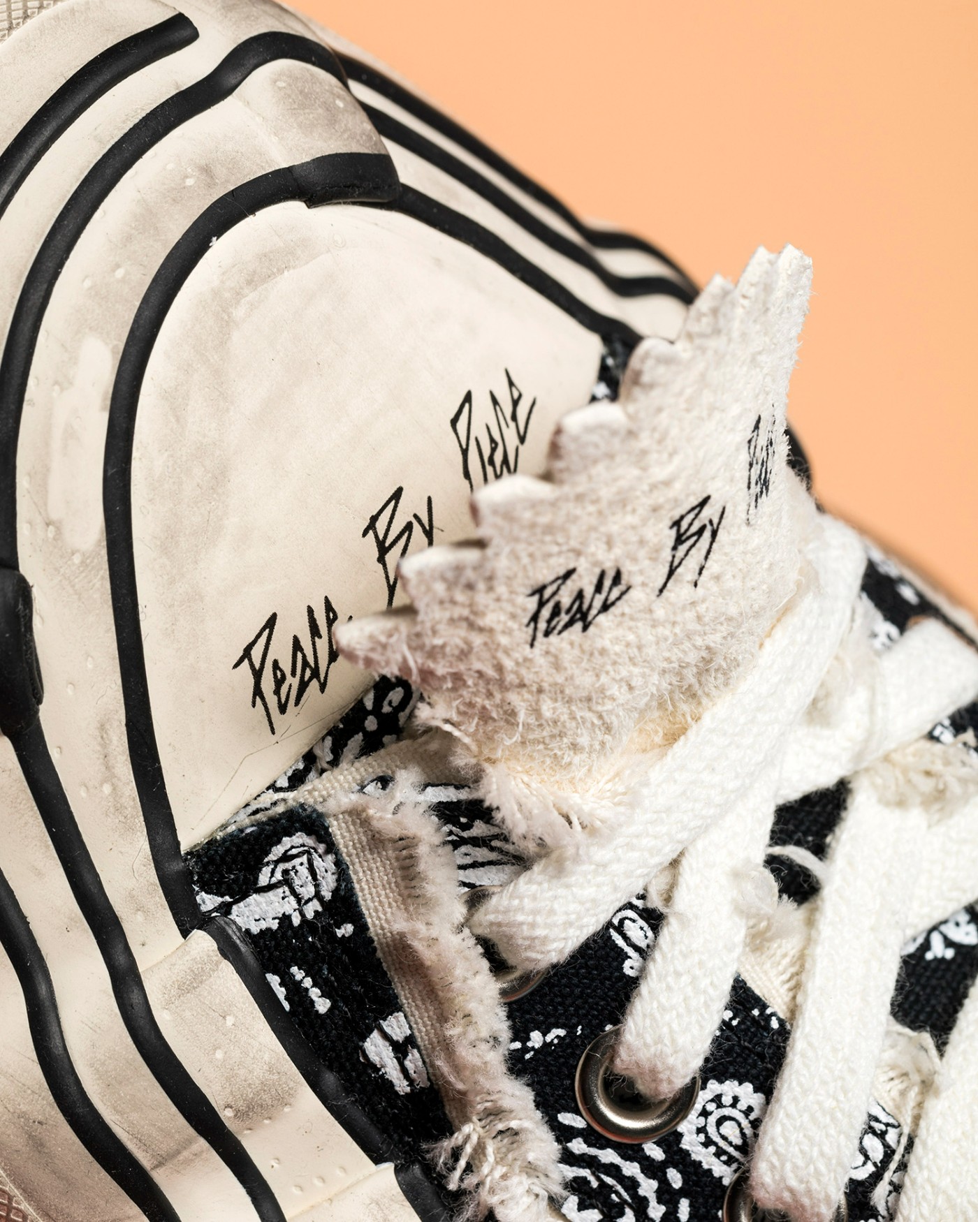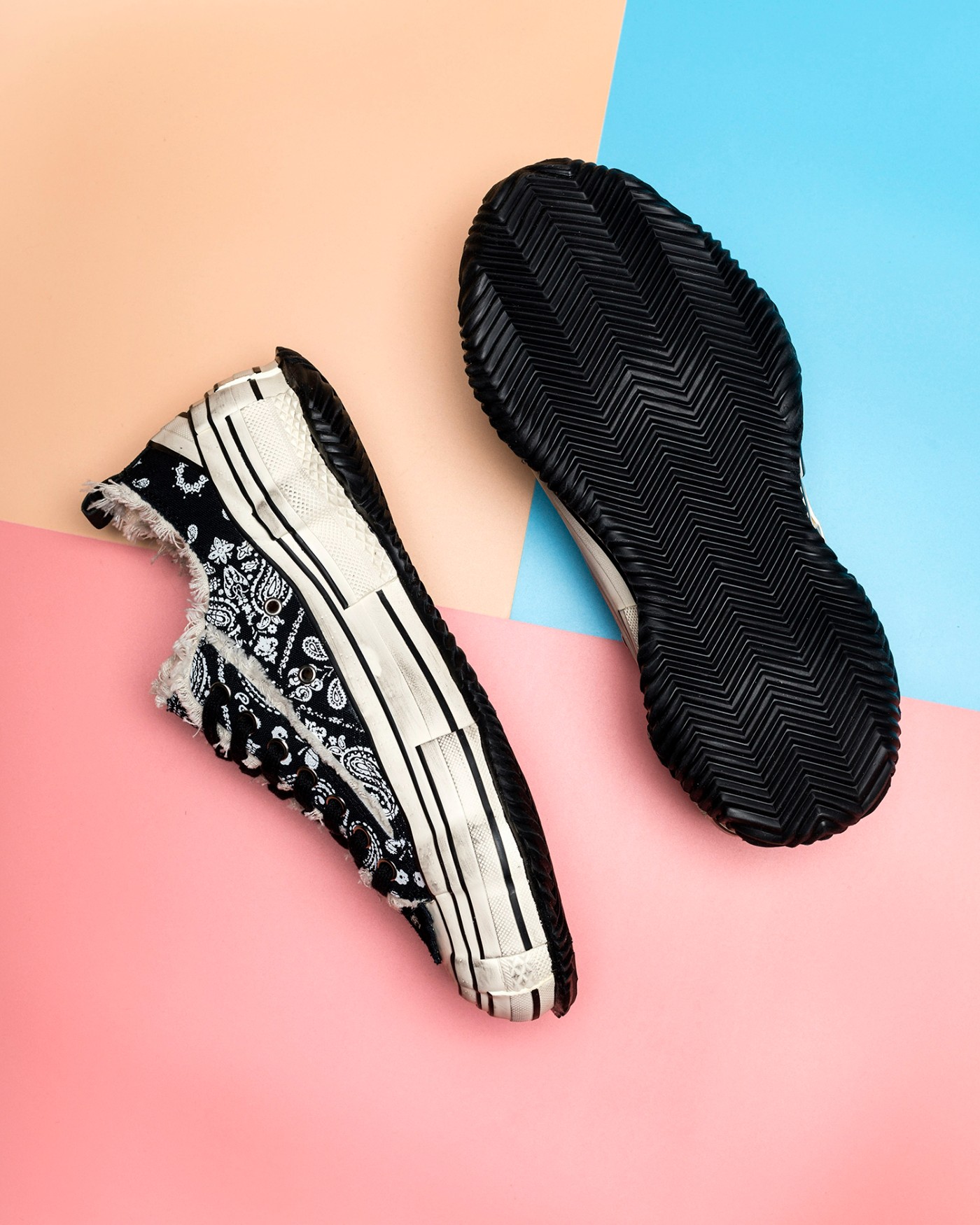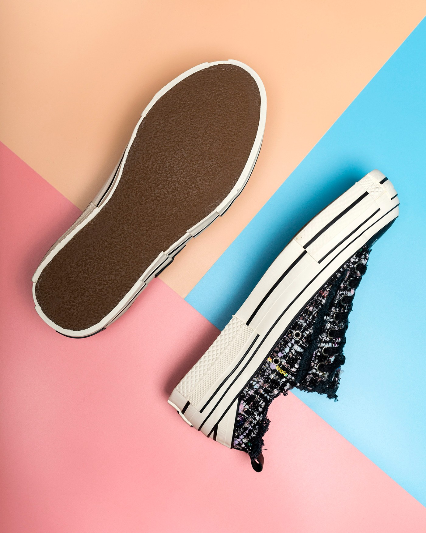 鞋面依旧是略带破坏效果的面料,但内部掺杂许多粉色、白色的细节,在黑色鞋面的衬托下像碎花一般。