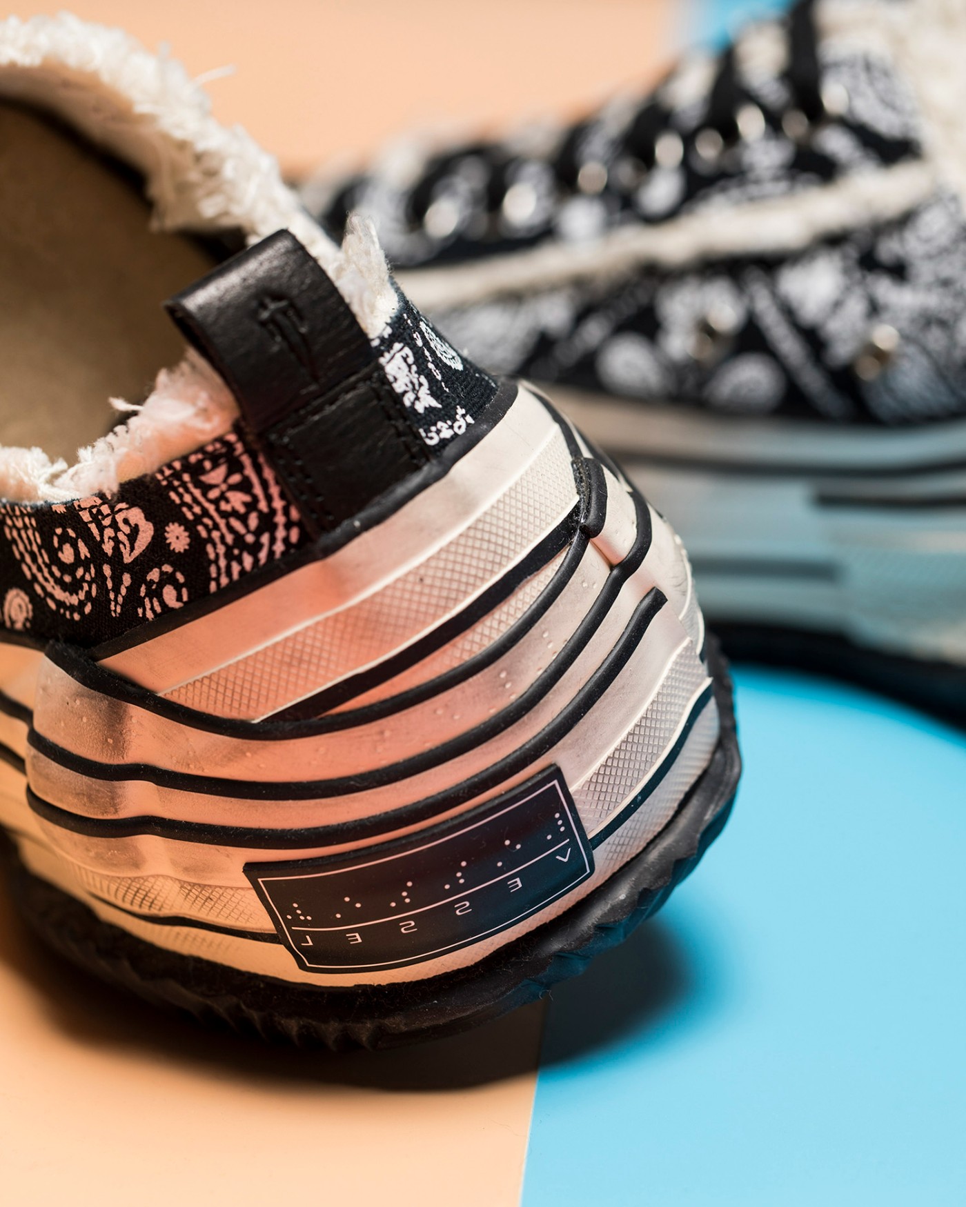 鞋标直接以补丁的形式贴在鞋侧的位置,配合中底错综复杂的建构,散发出浓浓的解构风。