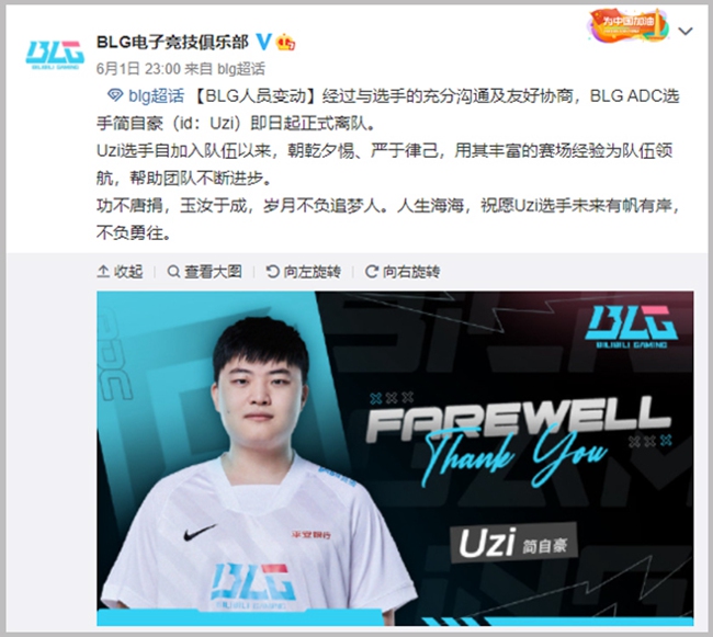 而除此之外,还有一个重量级消息就是 BLG 战队发布公告,Uzi 正式离队。