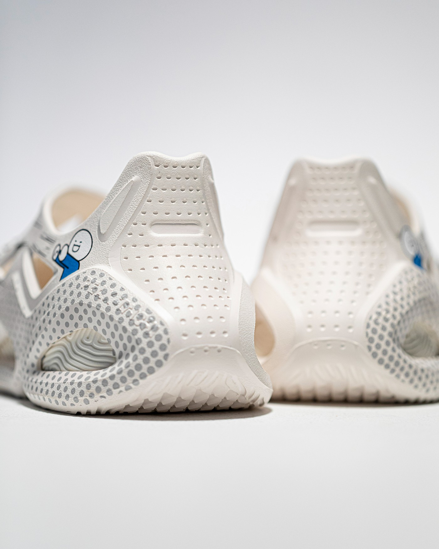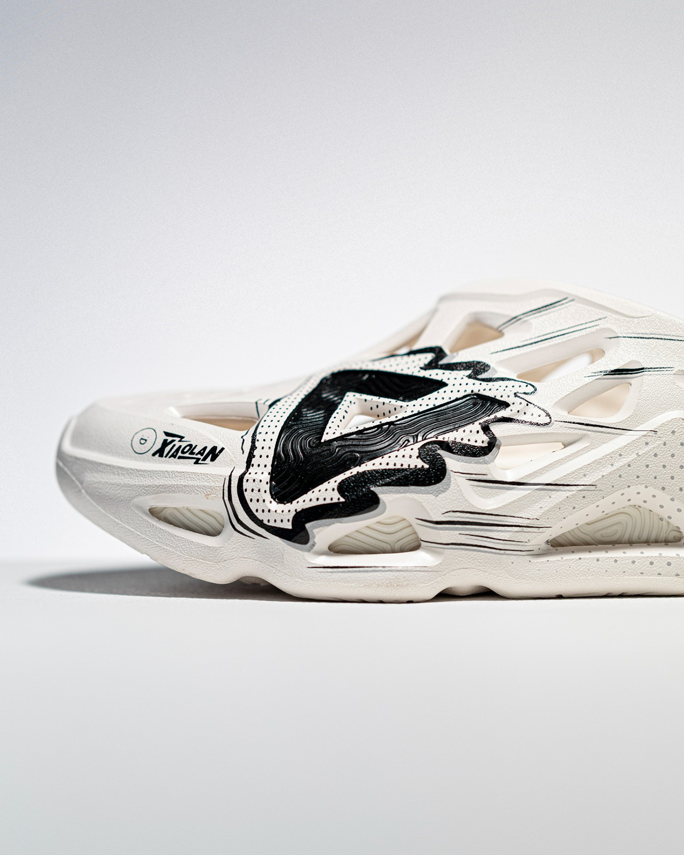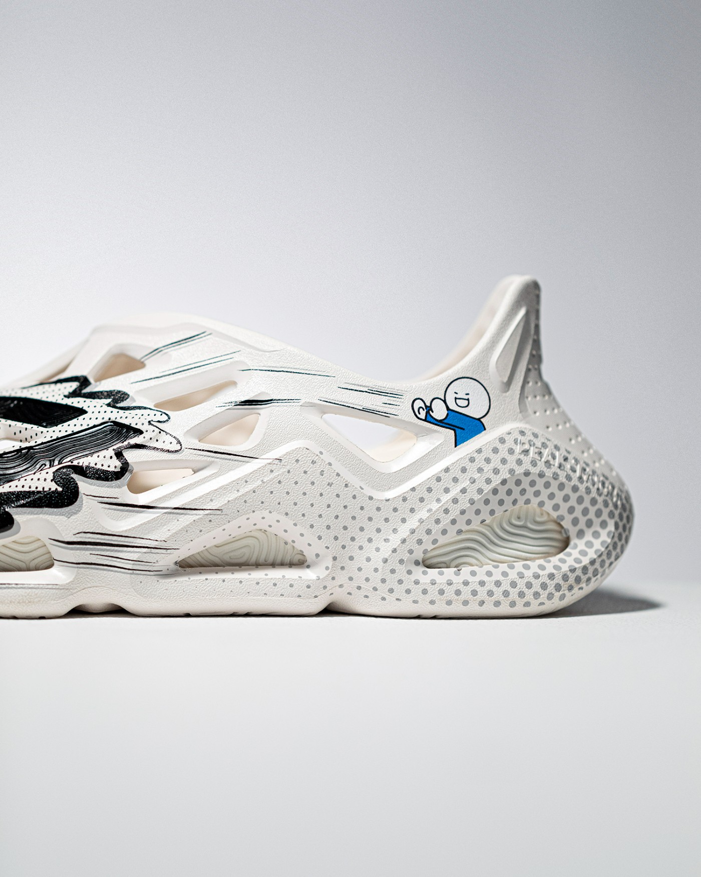 双方打造的这双联名款洞洞鞋,整体以米色调呈现,鞋身点缀波点和手绘线条,呼应书纸颜色及漫画元素。