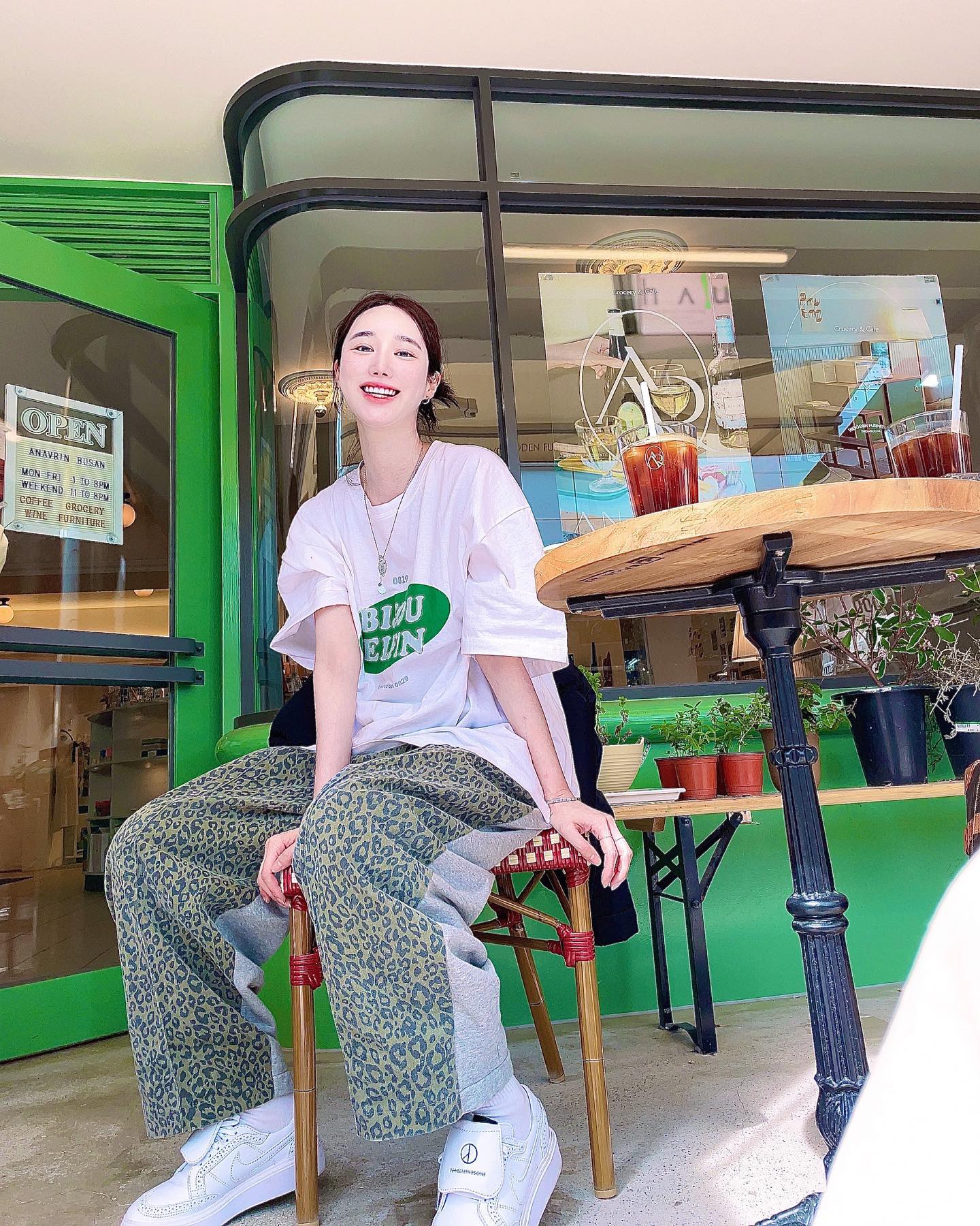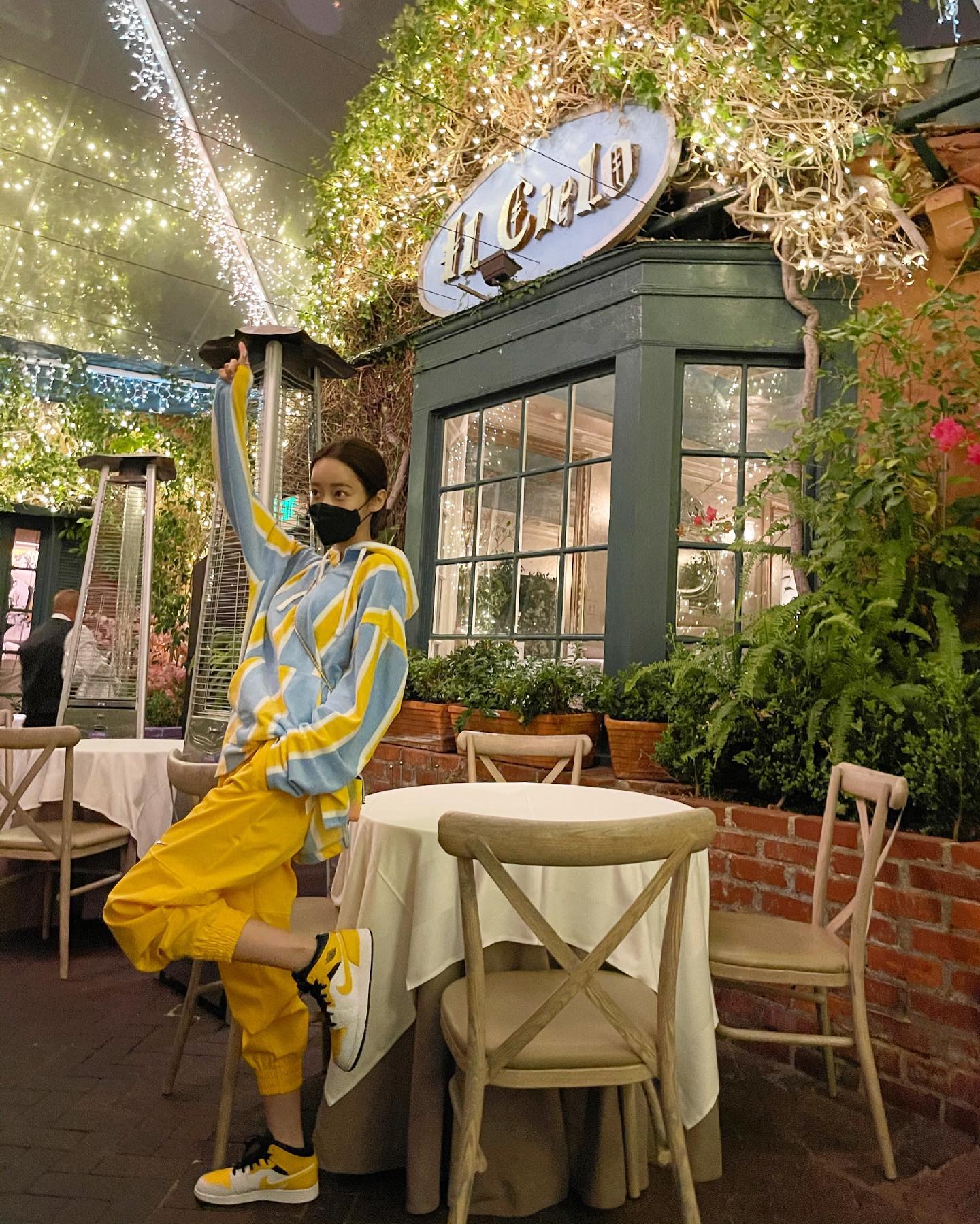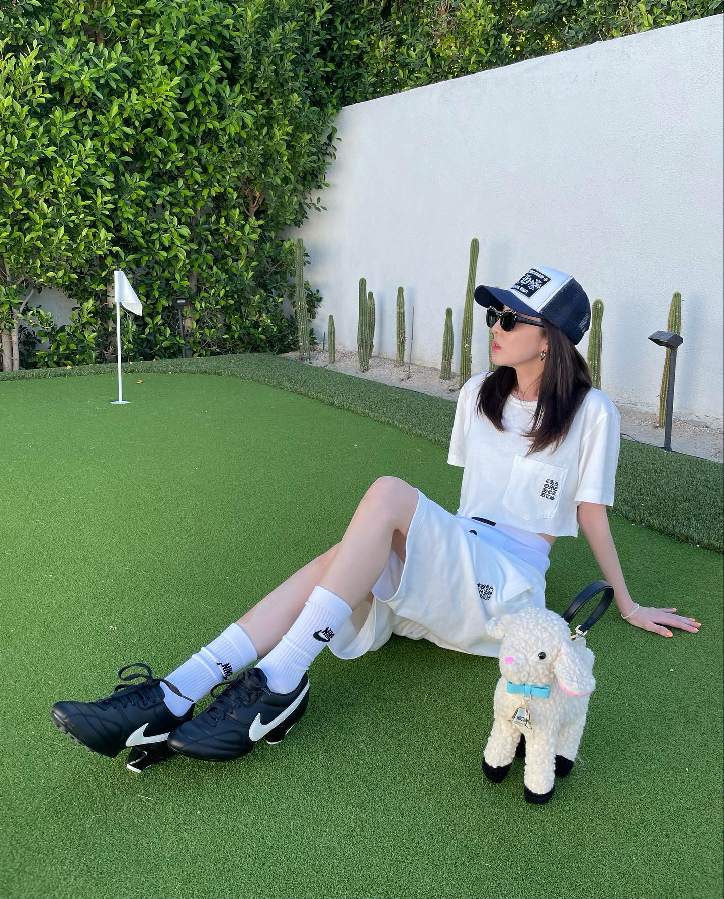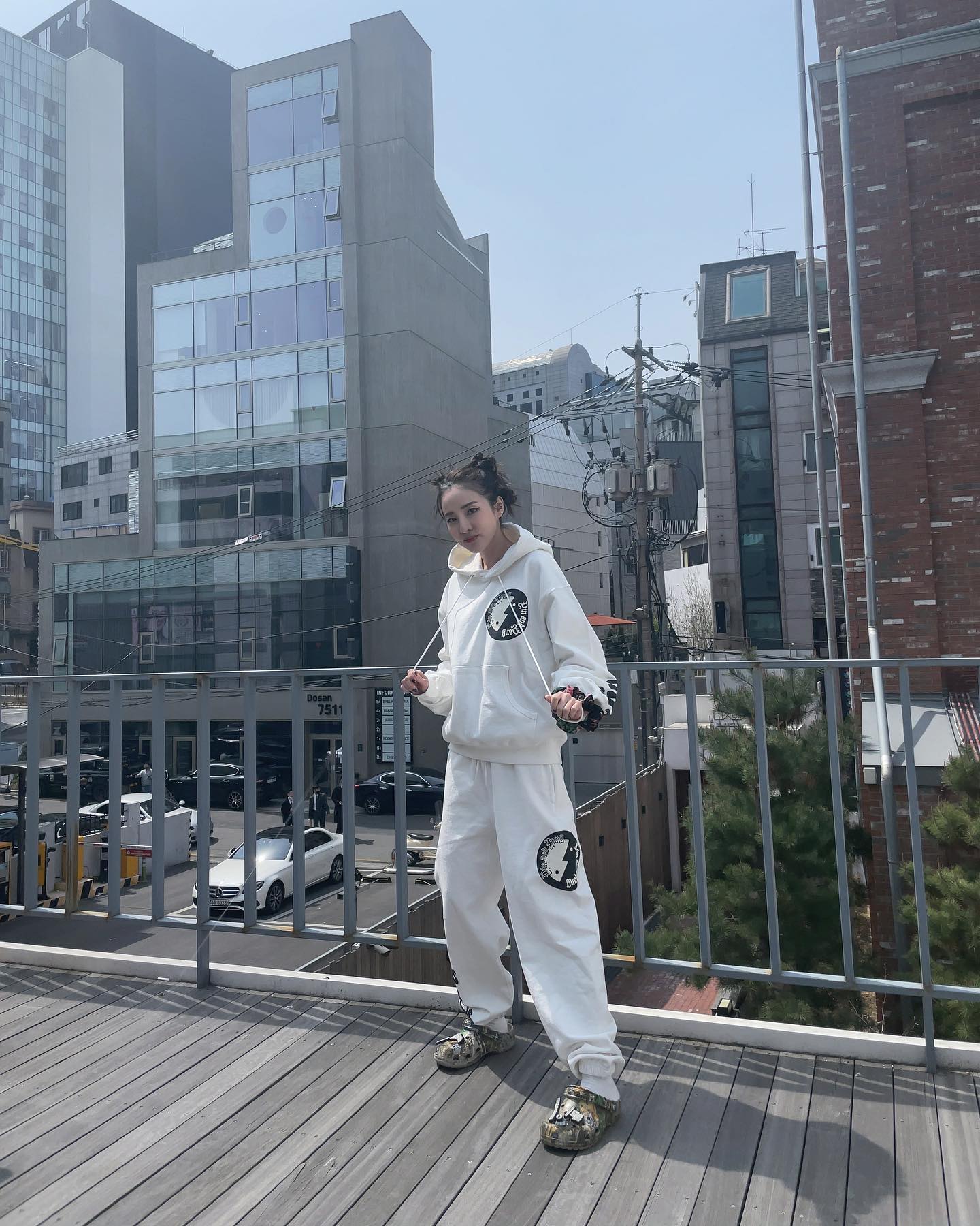 前段时间刚发售的 Nike Air presto “Hello Kitty” 早早就安排上了,搭配同系列服饰,亮丽夺目的蓝色总会给人一种青春的气息,谁能想到 Dara 今年已经 38 岁了呢?
