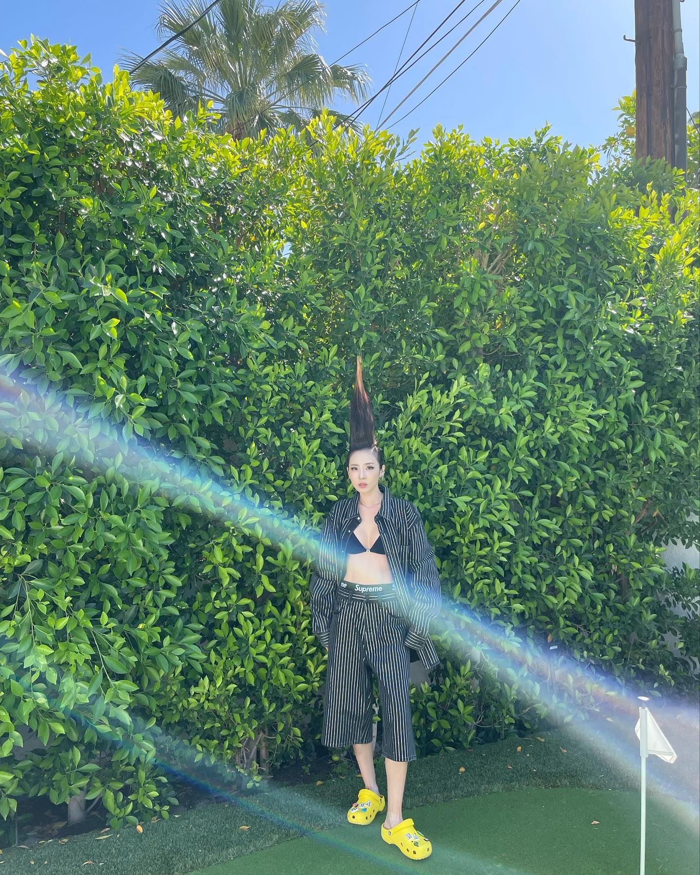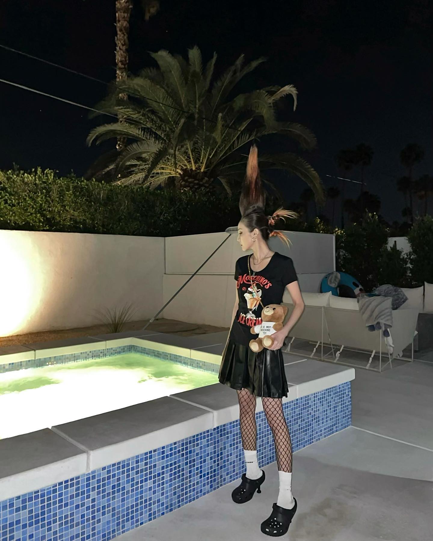 上身的黑色短袖 T 恤很显瘦,下身渔网袜 + 皮裙,搭配 Crocs x 巴黎世家洞洞鞋,还有让人移不开眼的发型,朴山多拉转眼又化身酷劲十足的性感女郎。