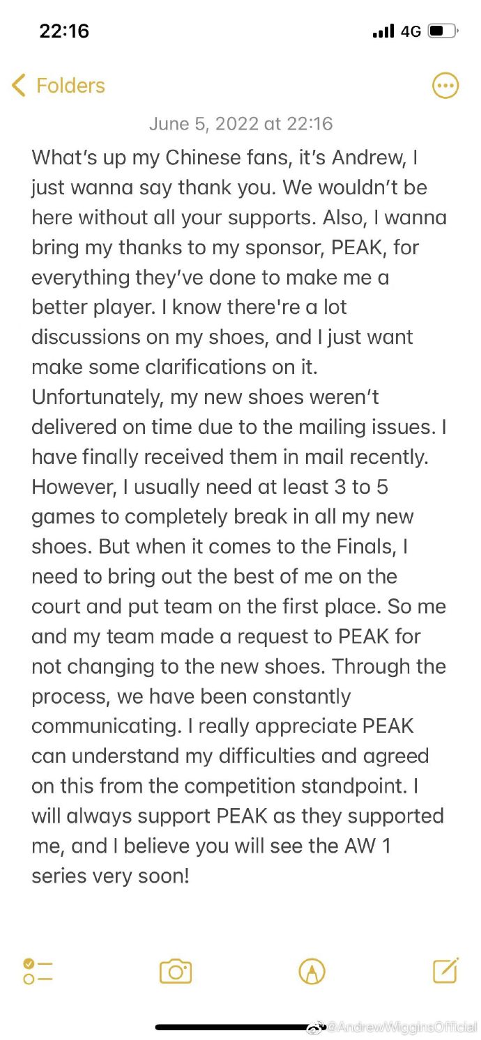 “所以我和我的团队向 PEAK 公司请求不要更换新鞋。”