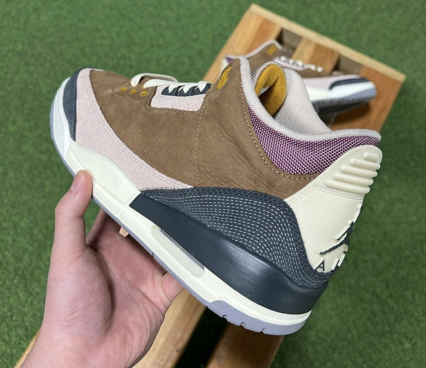整体材质和一般的 Air Jordan 3 有很大的区别,鞋面采用不同颜色的麂皮拼接而成。