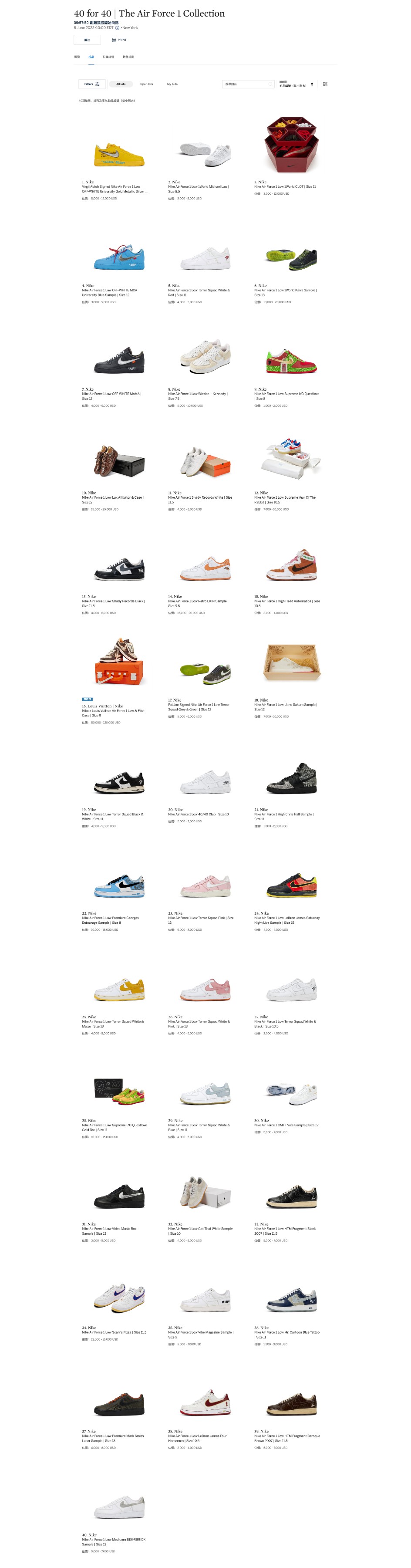 我们熟悉的盛产天价拍品的苏富比也借此机会上架了一套 Air Force 1 拍卖活动,一共 40 双,虽然不少都是有年头的「老鞋」,但是却款款重磅,没有一双是「无名之辈」!