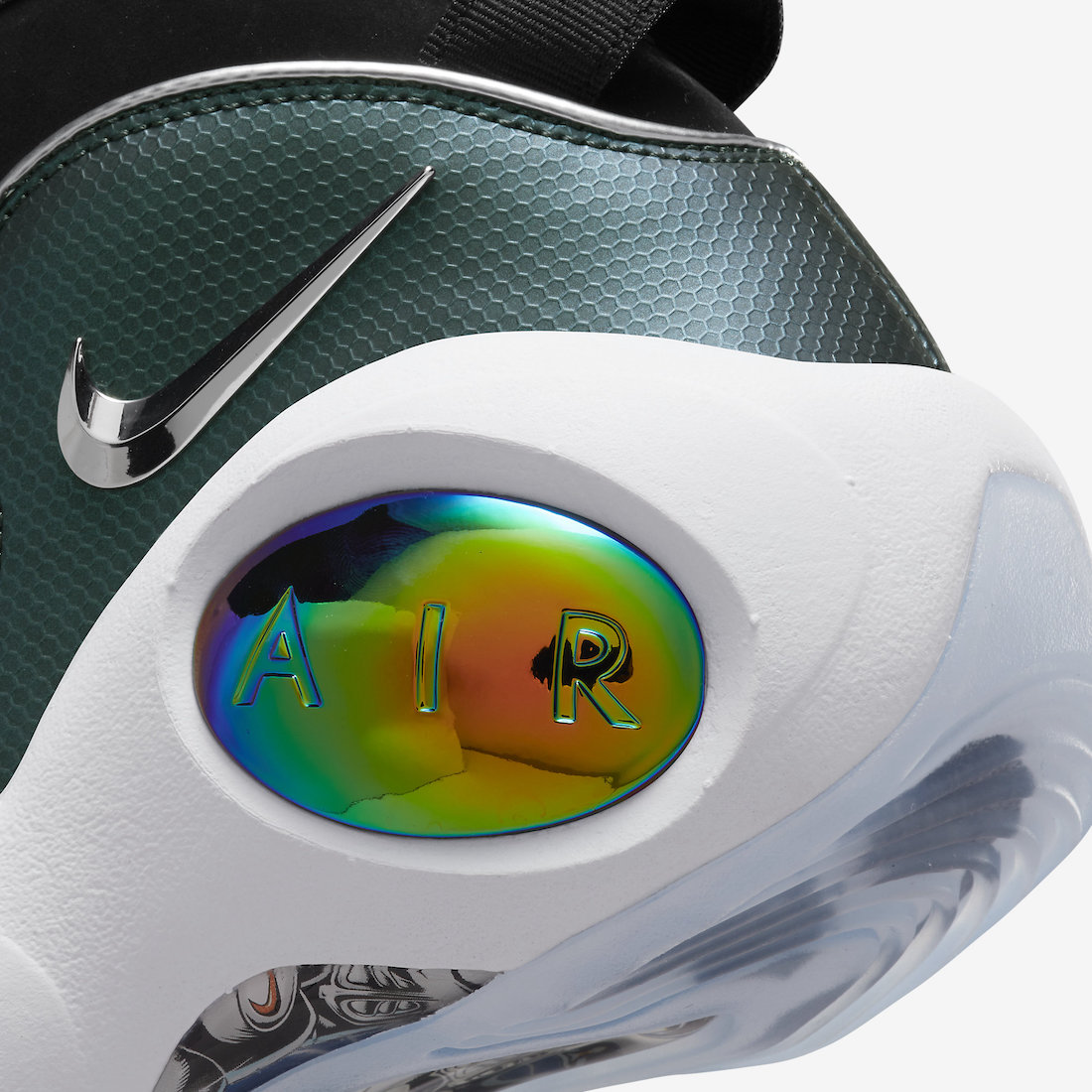 中底的「大眼睛」则采用了炫彩变色,仿佛是还原 NIKE SWOOSHMAN 的眼镜。