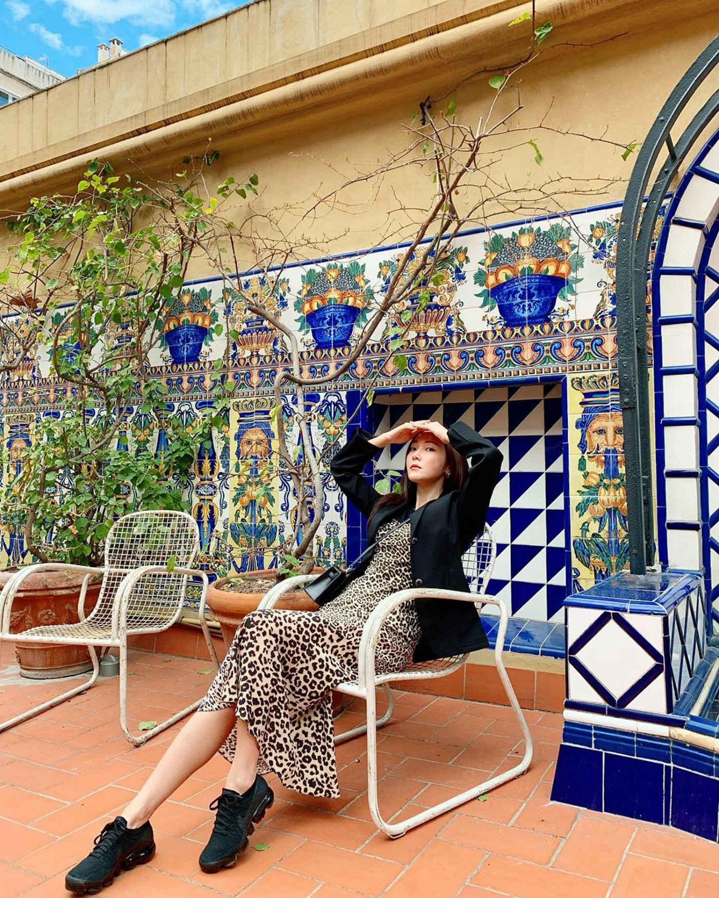 就像这双纯黑配色的 Nike Vapormax,一身豹纹长裙搭配西装,与鞋款产生小呼应,又辣又飒。