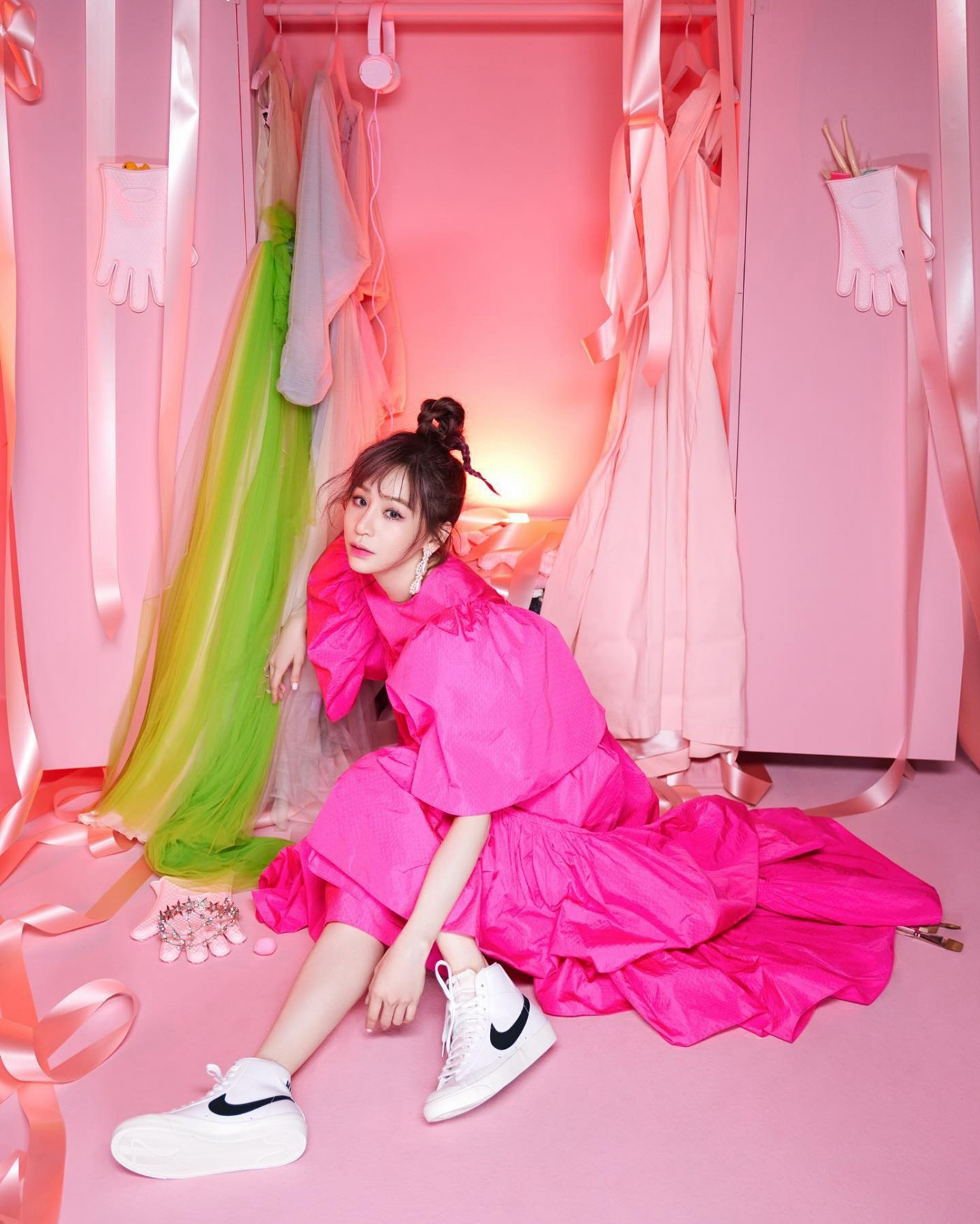 粉色连衣裙搭配黑白配色「某甘鞋」Nike Cortez,甜美气质溢出屏幕。