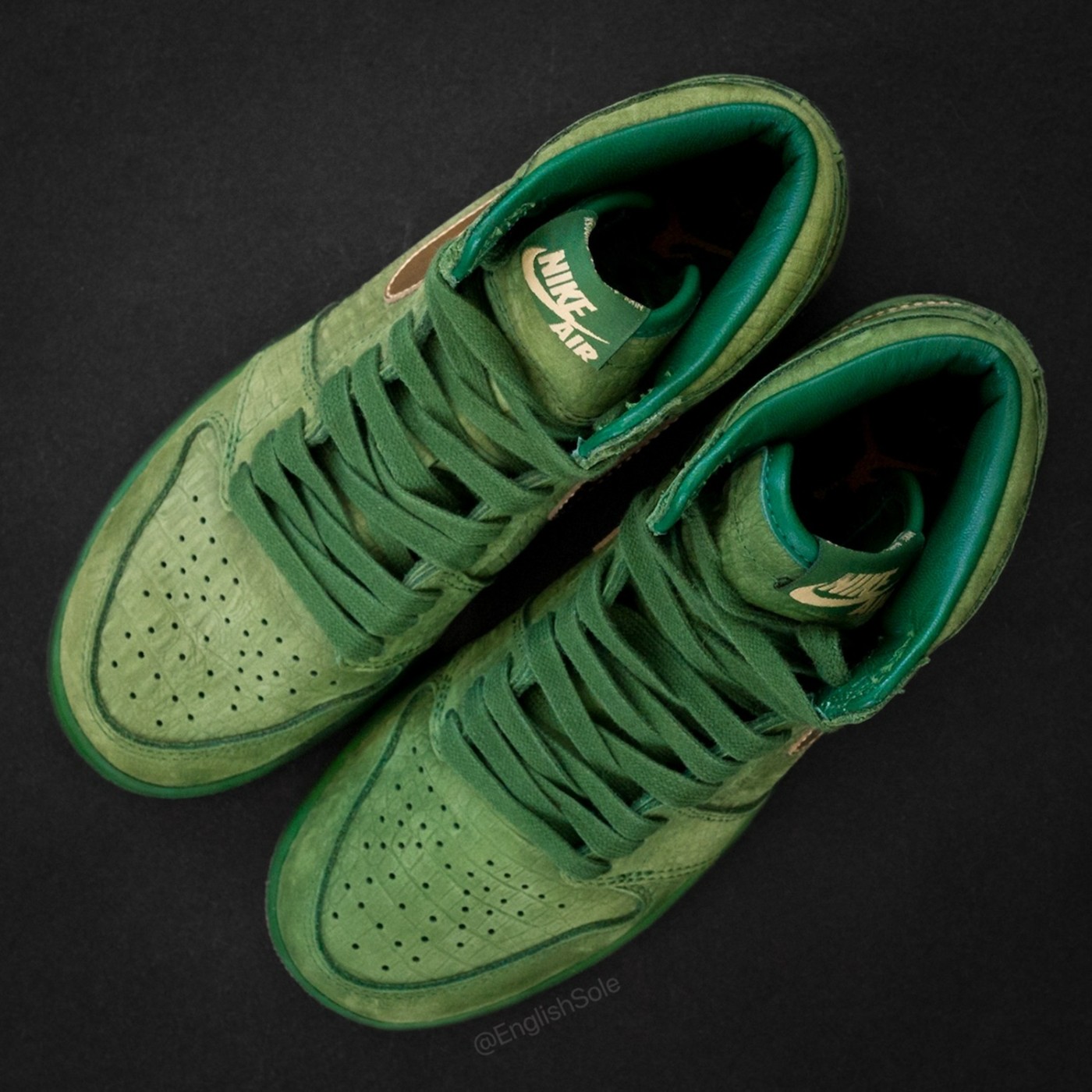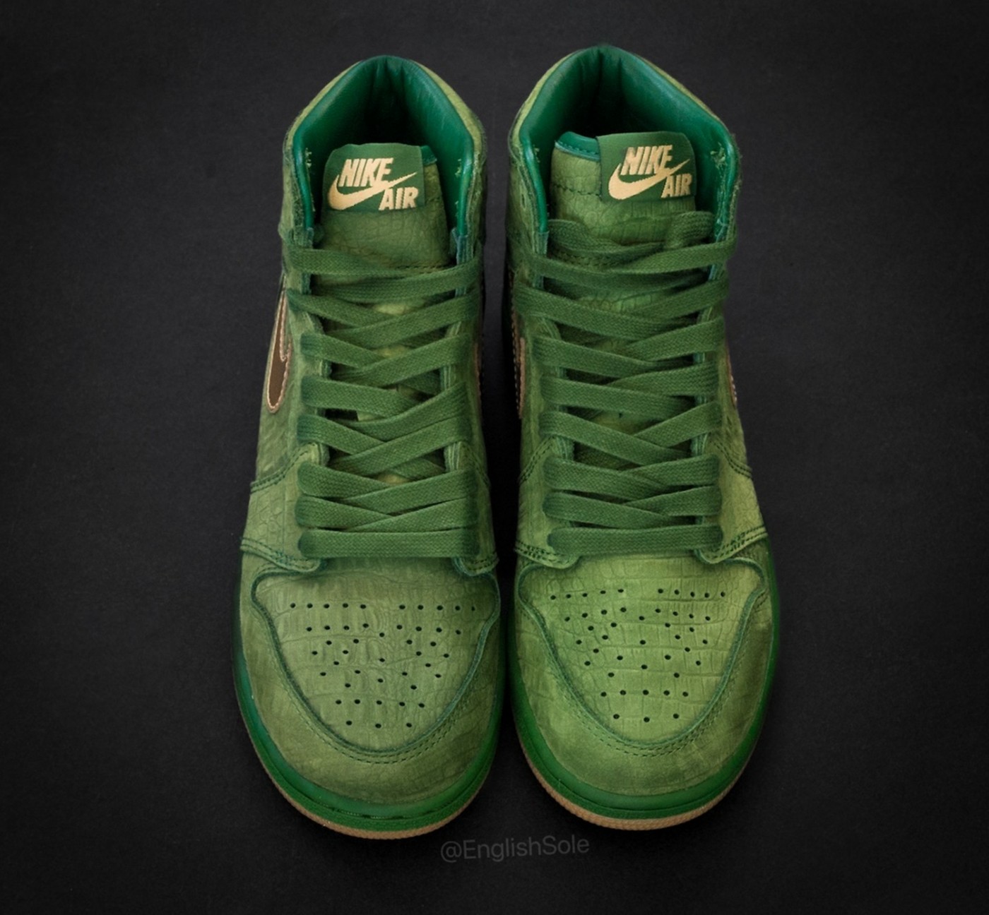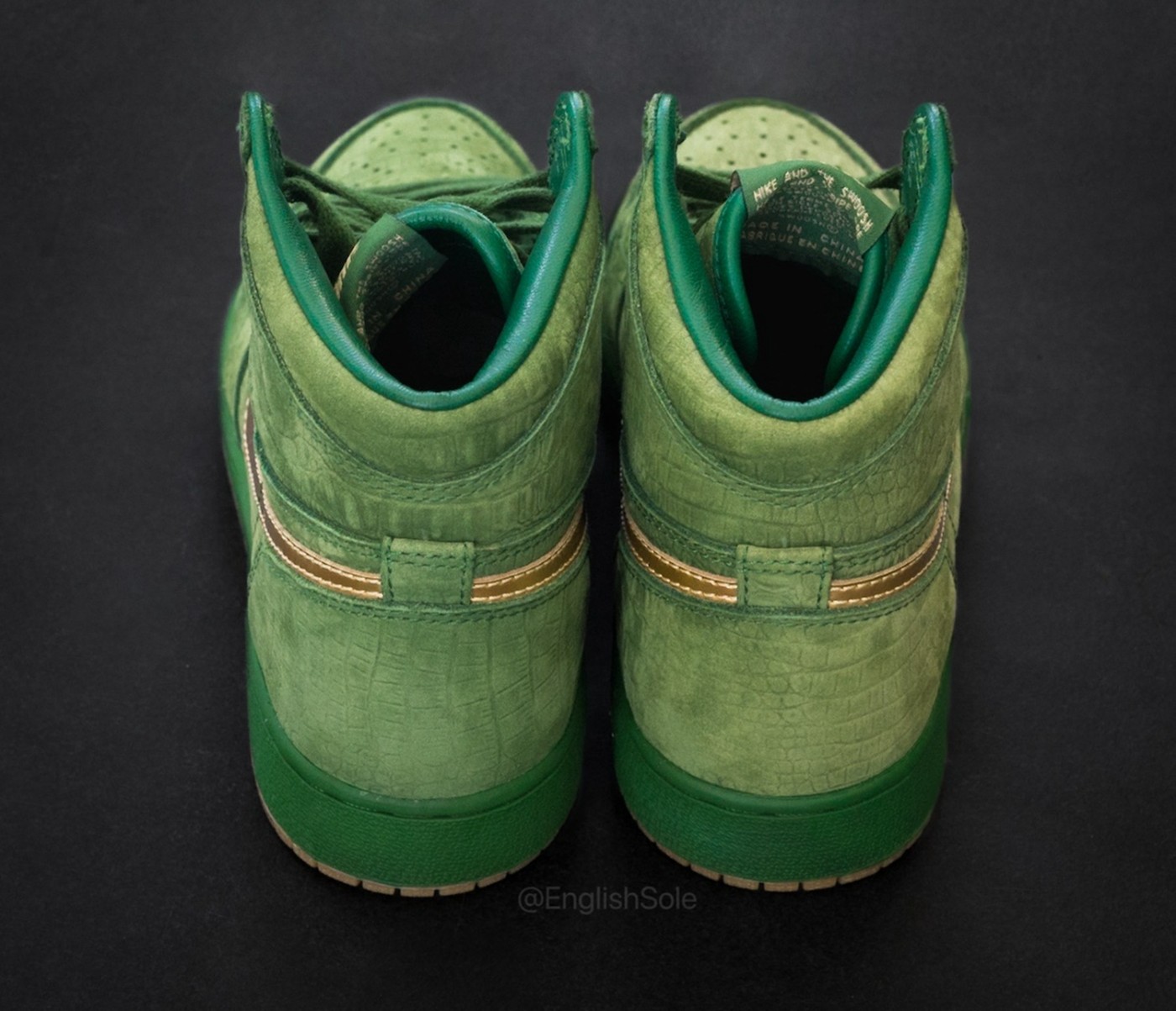 整体规格相当之高,首先就是鞋面,以祖母绿色的鳄鱼纹麂皮覆盖,尽显奢华质感。