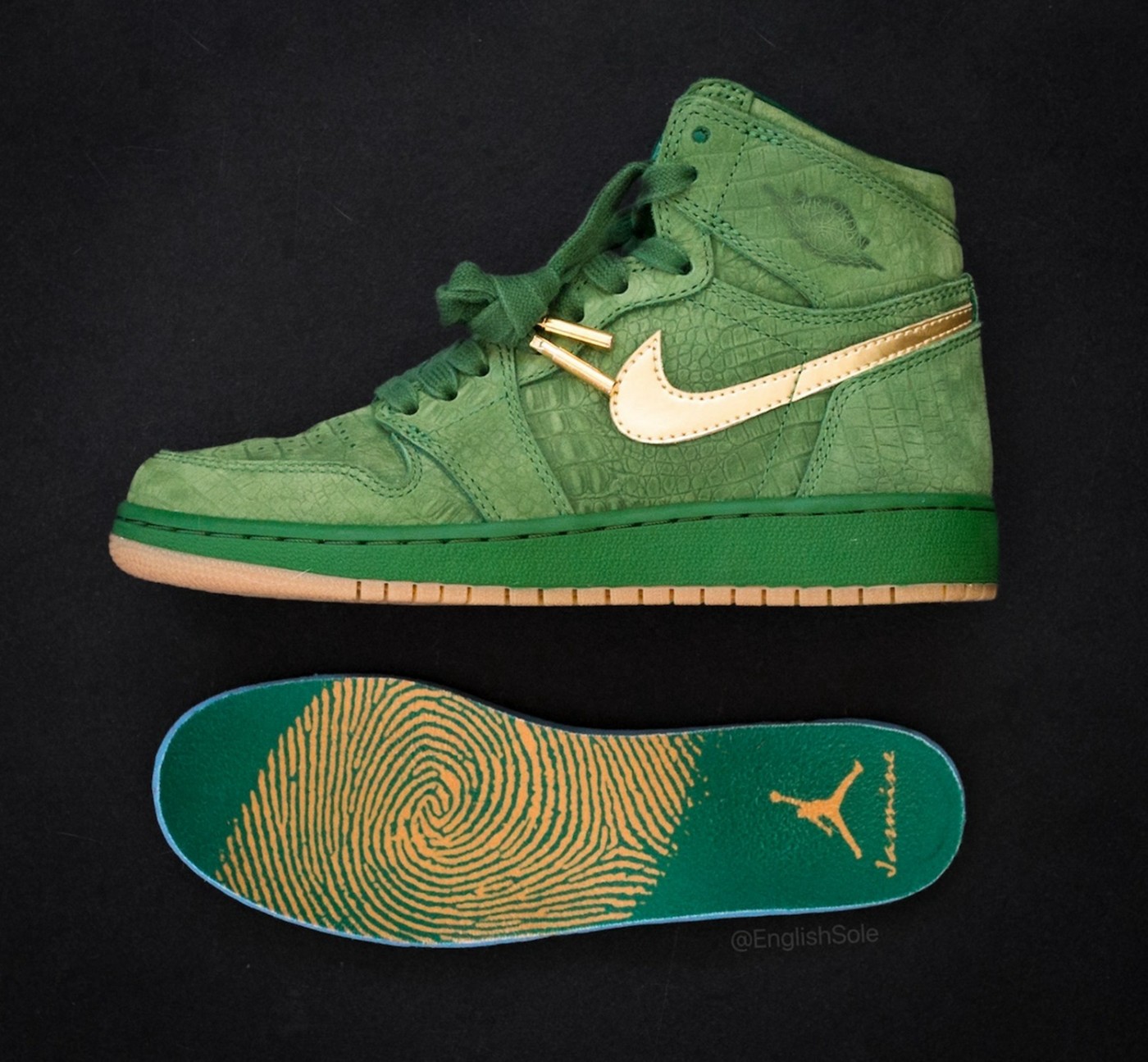 鞋垫印有金色的乔丹本人指纹和女儿贾丝明的名字,强调配色主题。