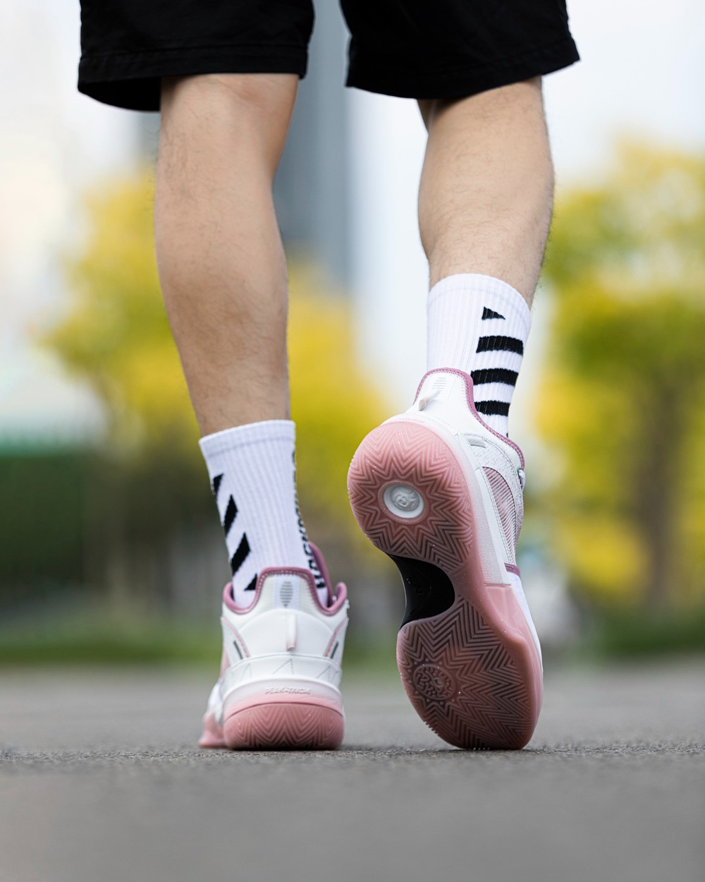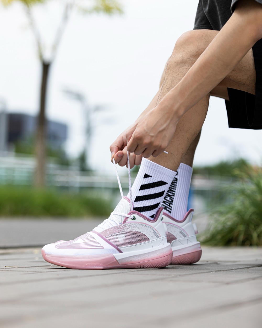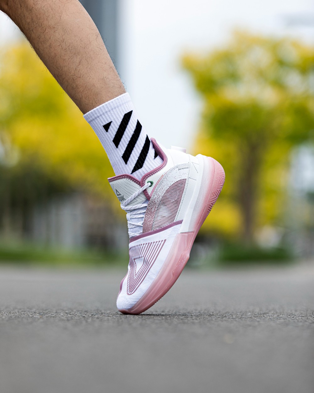 先来看第一双态极大三角,以李淳风的生平经历为设计灵感,配色以白、粉色呈现,极具辨识度的大三角搭配鞋面银色花朵刺绣,颜值甜美又清爽。