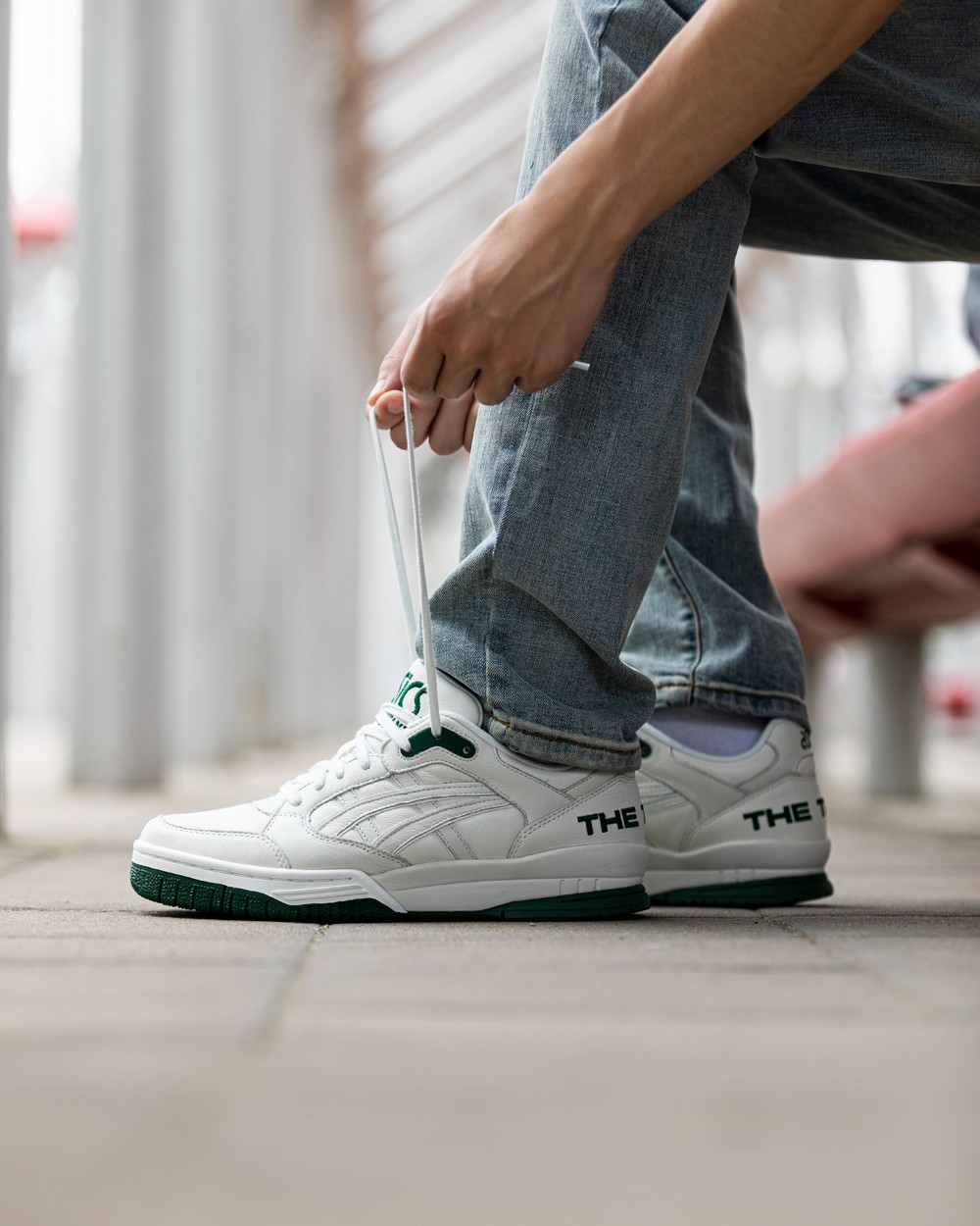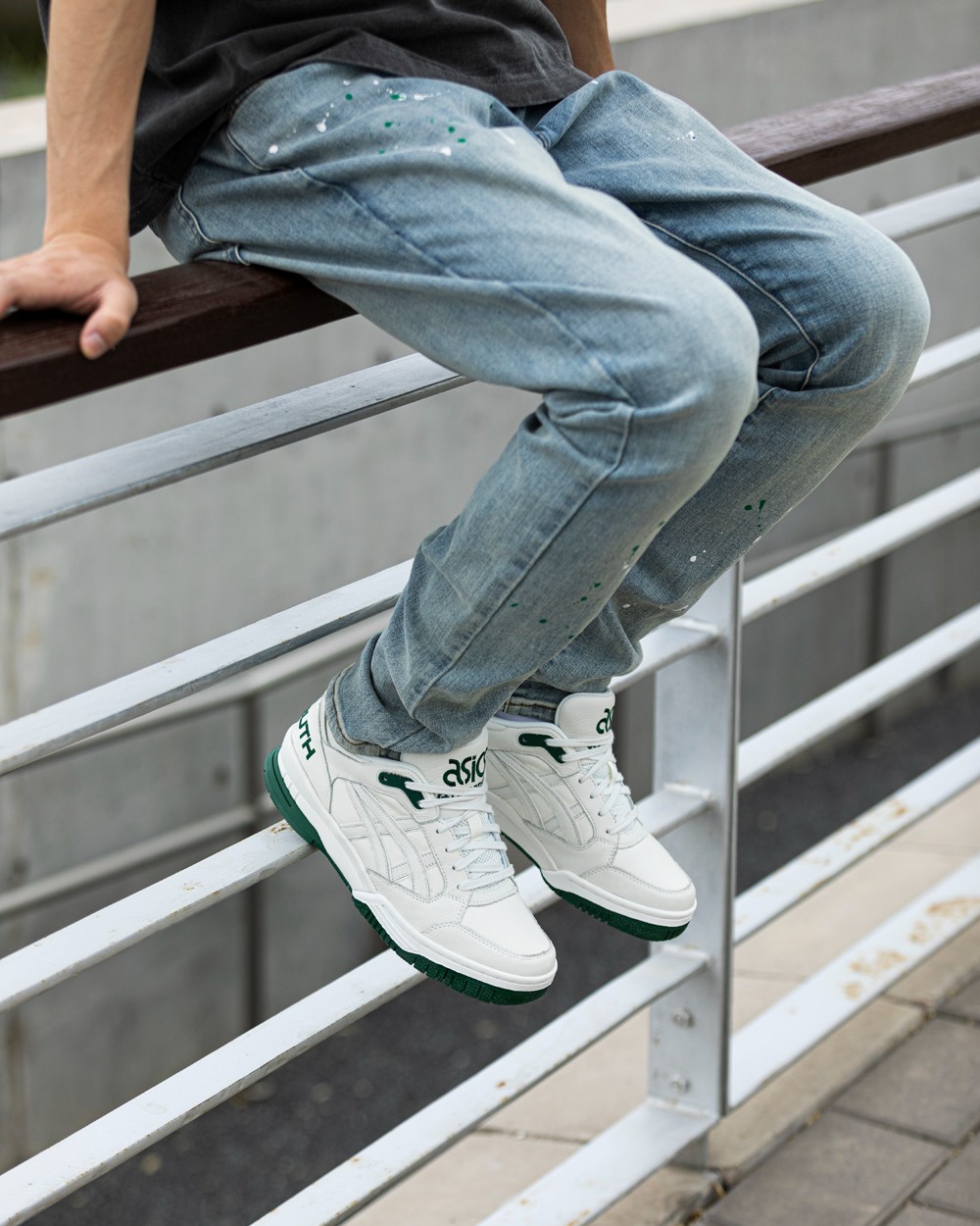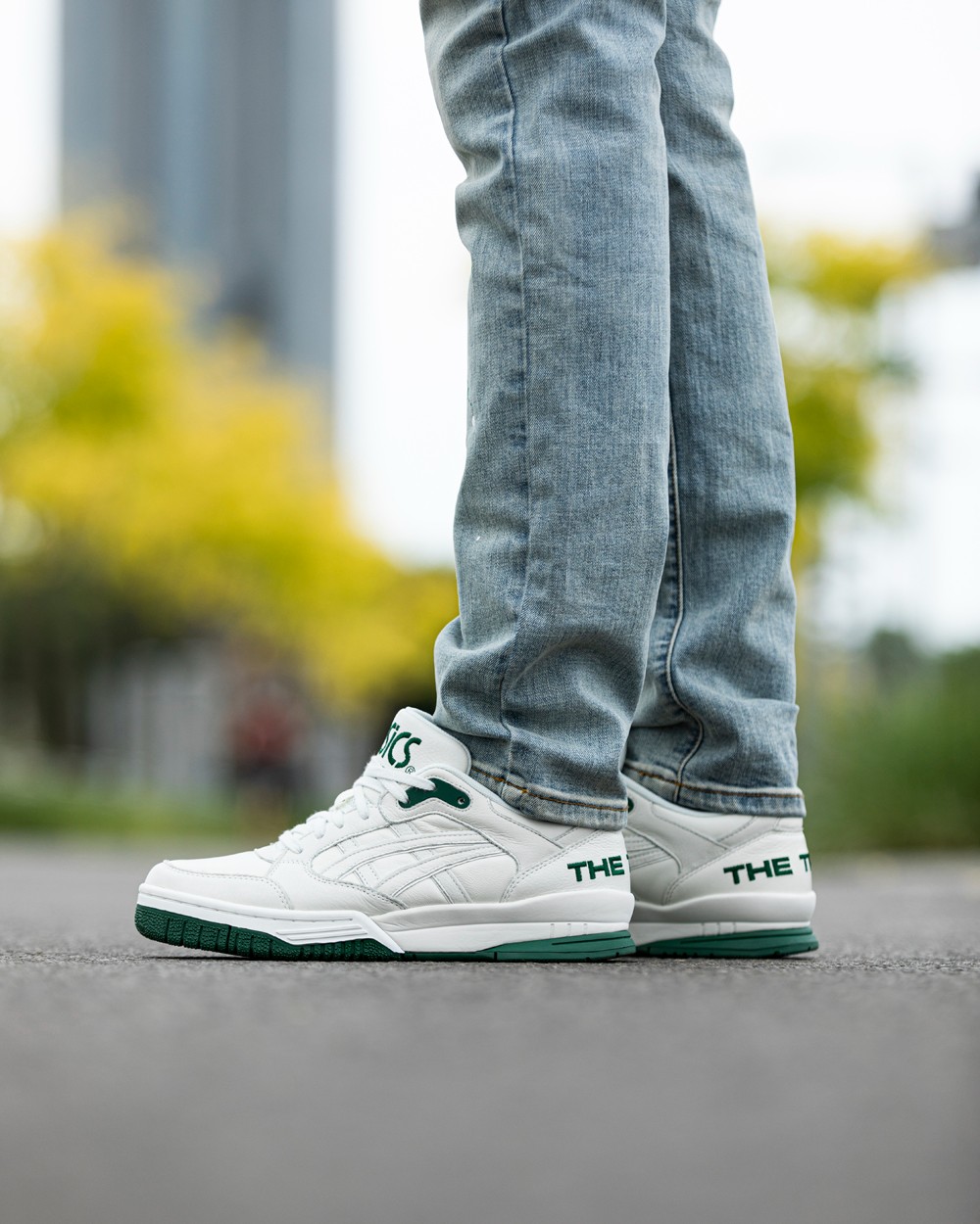 以 90 年代 NBA 传奇球星伊塞亚·托马斯的战靴 GEL-SPOTLYTE OG 为蓝本,配色方面采用白绿撞色呈现,很好的保留了鞋款的复古感。