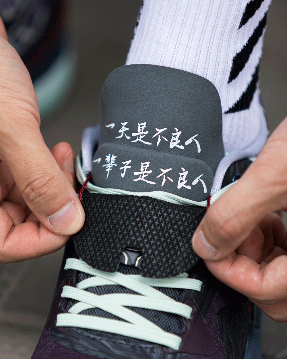 最有意思的设计就是将袁天罡银灰色面具放在了鞋舌部分,外层可以拆卸,内部印有「一天是不良人,一辈子是不良人」的字样。