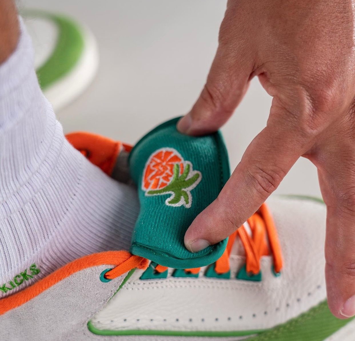 鞋面色彩以帆白为主,点缀橙、绿的配色方案,颇有一种夏日活力气息。