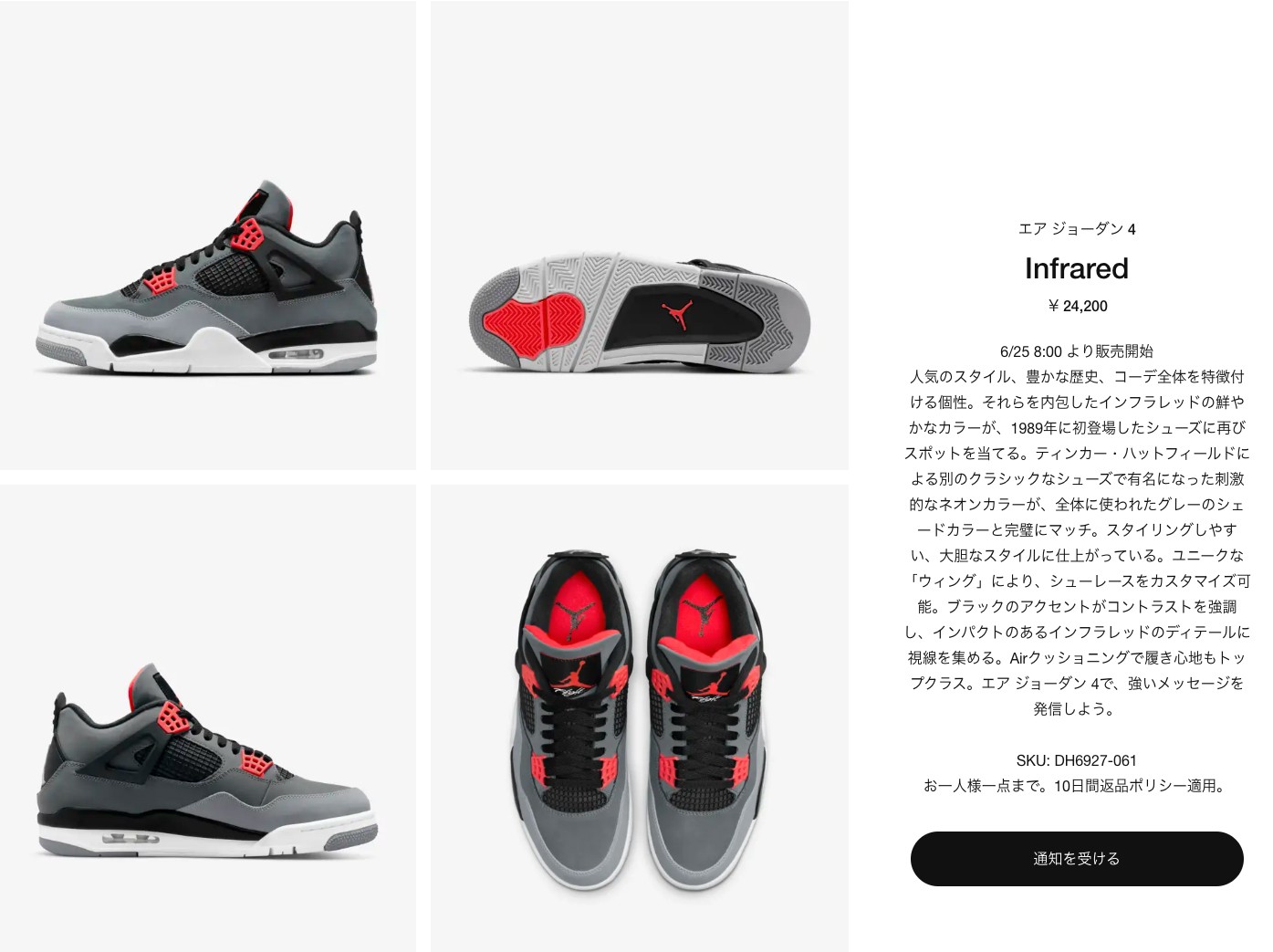 目前,全新 Air Jordan 4 “Infrared” 已经登陆日本地区 SNKRS,确定将于 6 月 25 日正式发售。