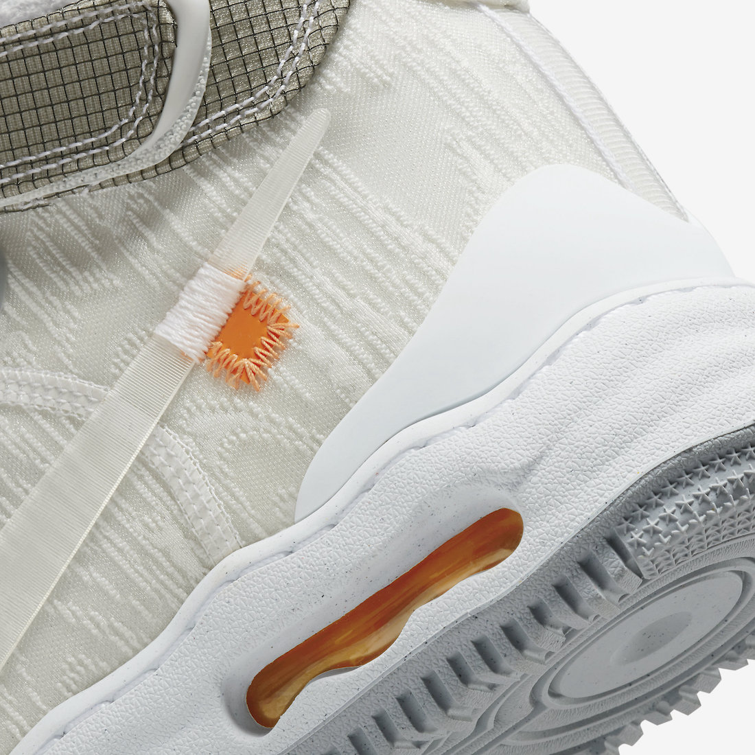 中底后跟部位采用溶解造型示人,并罕见加入开窗可视气垫设定,以此彰显 Air Force 1 气垫篮球鞋的历史定位。