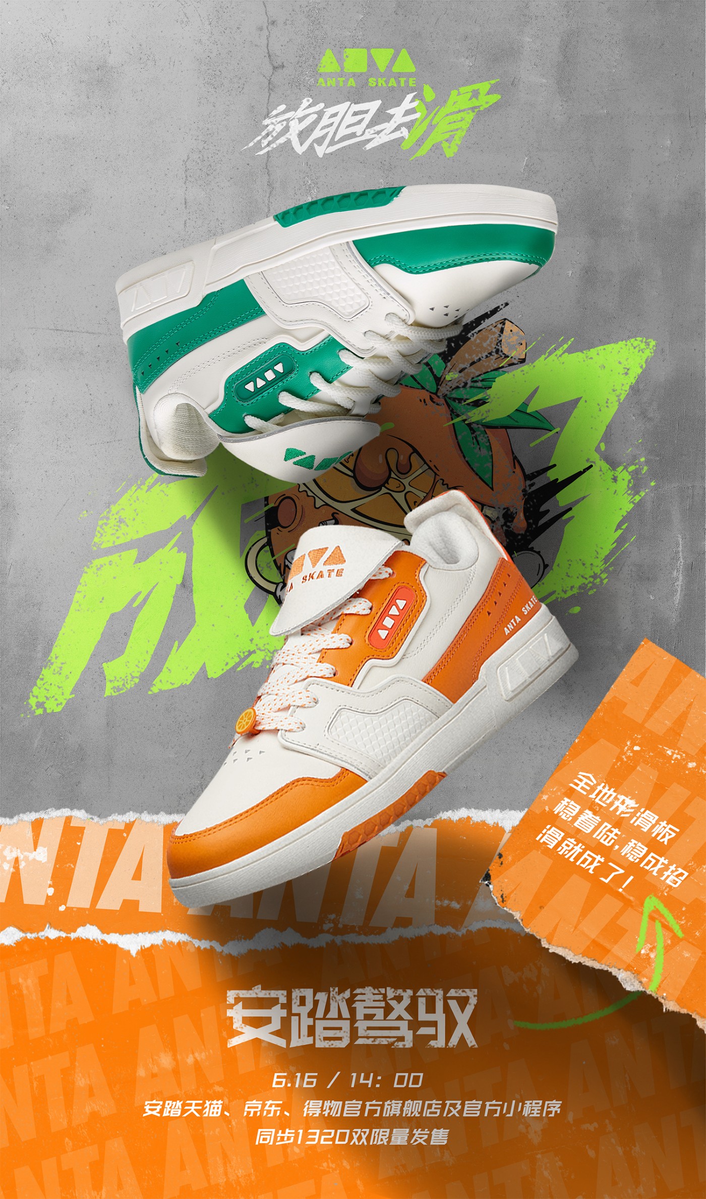 三角形与正方形的立体字母,既源于 ANTA 字样的演变,同时灵感也来自于滑板场地的道具。