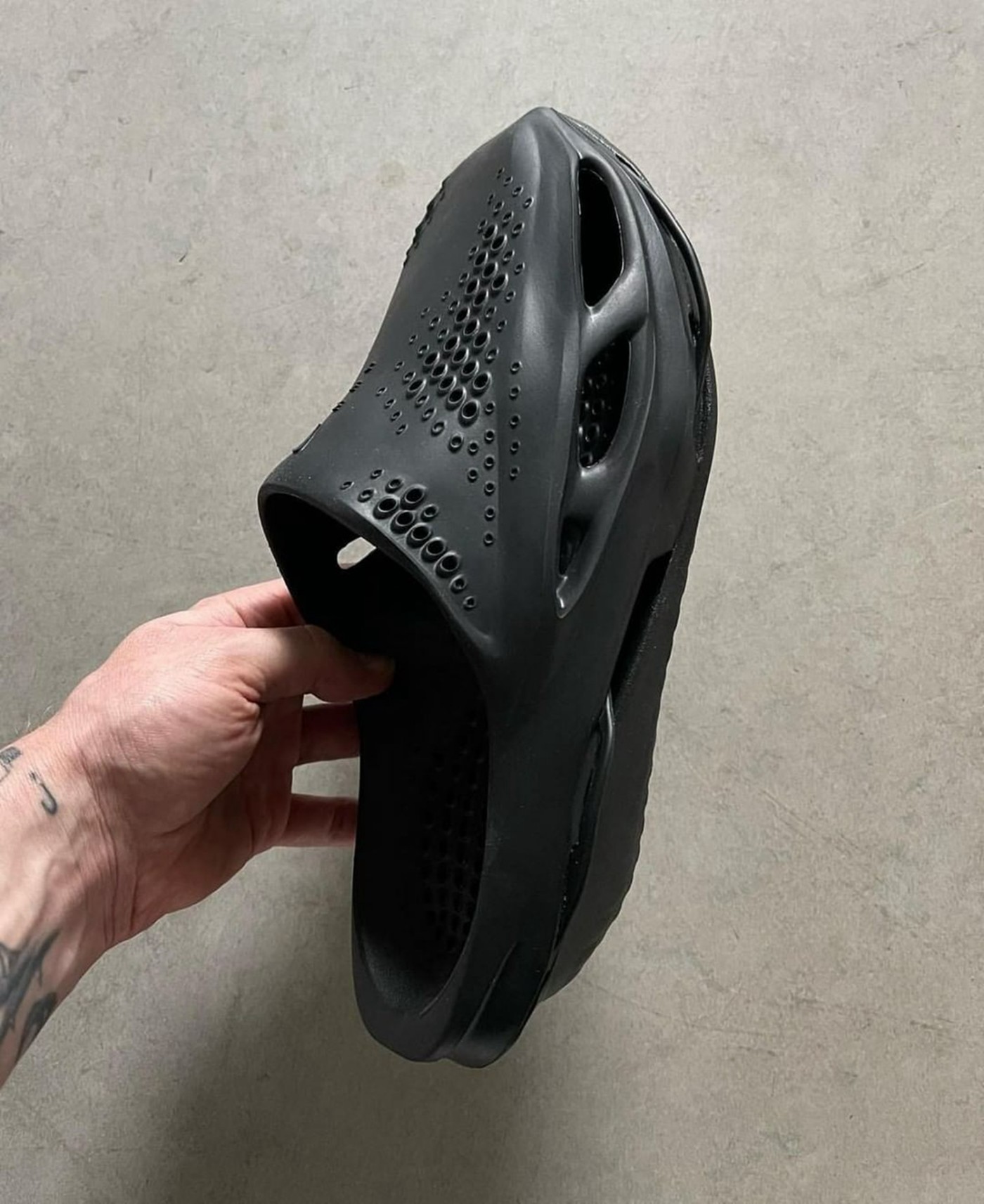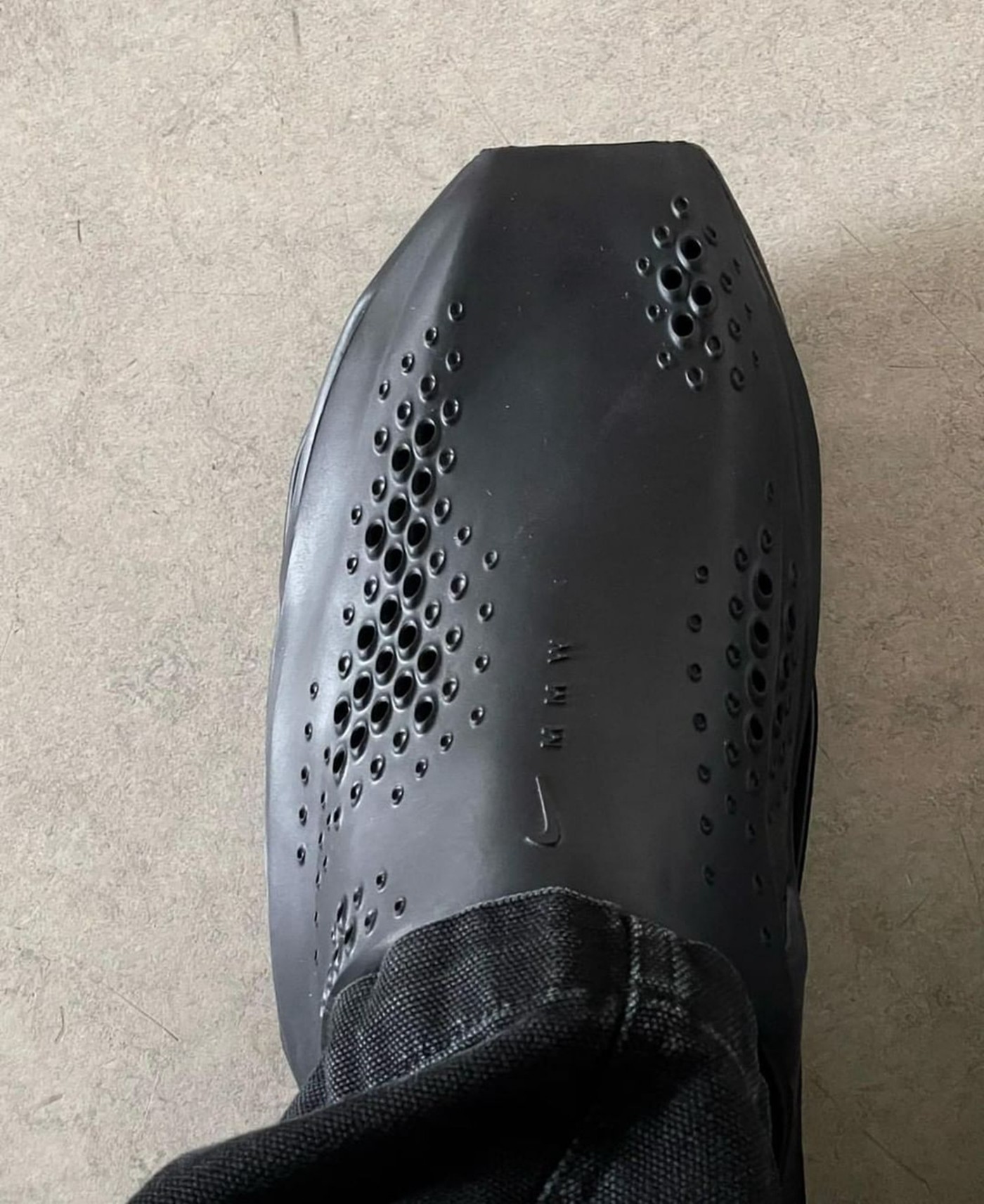 鞋面密布透气小孔,生物感十足,最后点缀浮雕样式的 Swoosh 和 MMW 字样,彰显联名身份。