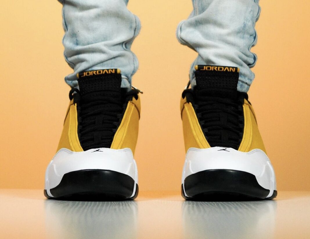 整双鞋以黄色麂皮材质打造,以致敬 1999 年发布的 Air Jordan 14 Low “Ginger” 经典配色,呈现出「法拉利」主题。