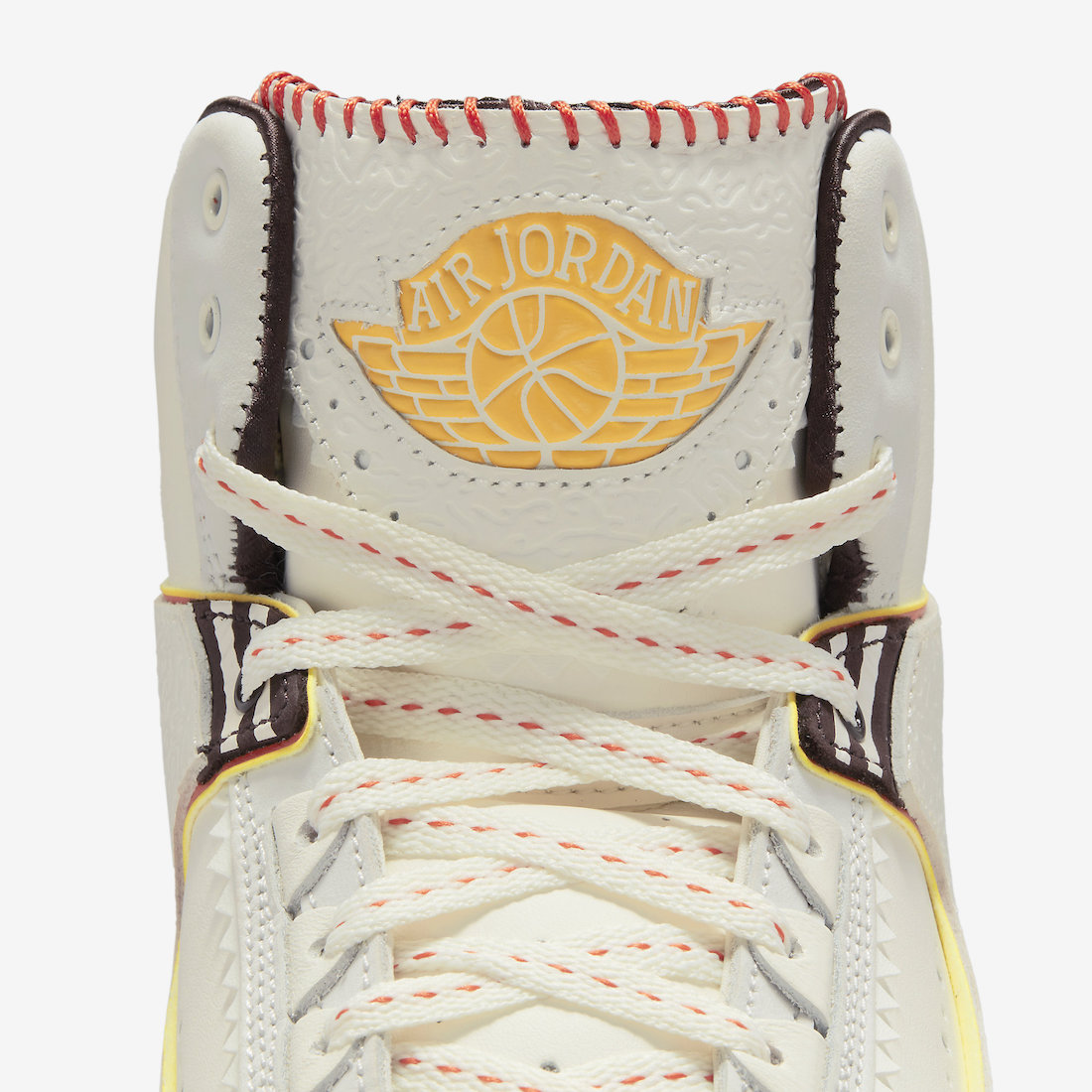 无论是鞋面皮革的特殊压纹、还是颇具部落原始手工气息的鞋舌、鞋带车线,以及鞋带孔的锯齿状留边、颇具律动感的大小冲孔,都让这双 Air Jordan 2 呈现出极为独特的个性、时尚气质。