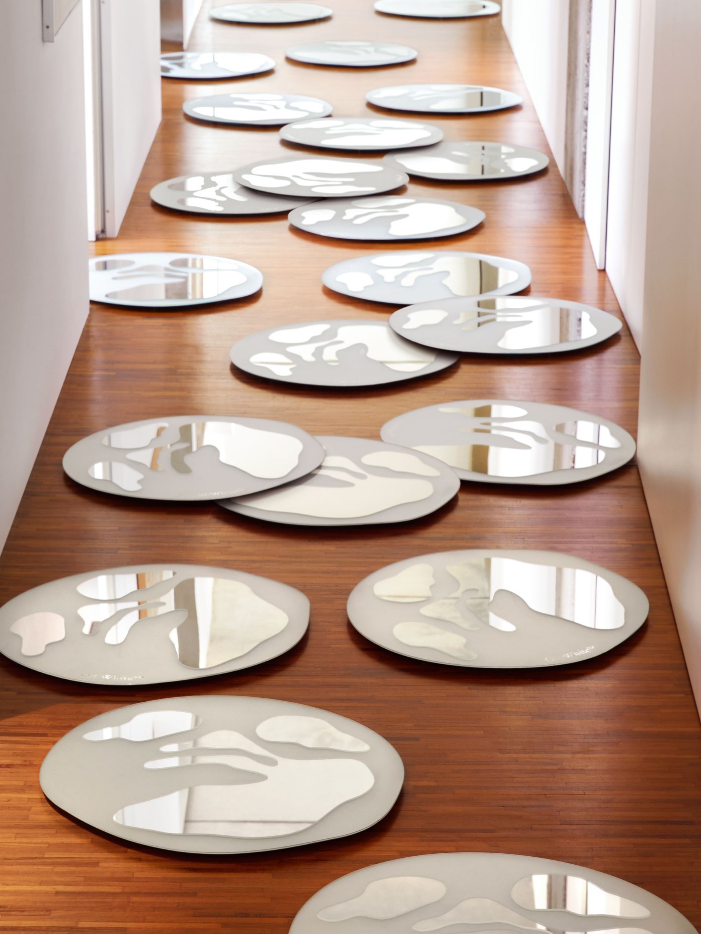 两⾯圆形镜⼦的轮廓也是通过不规则线条来塑造的,一款上是磨砂的 Face 标志,另一款则为引⽤语 “A MIRROR IMAGE”,每天用它们照镜子,颜值也会提高不少吧?