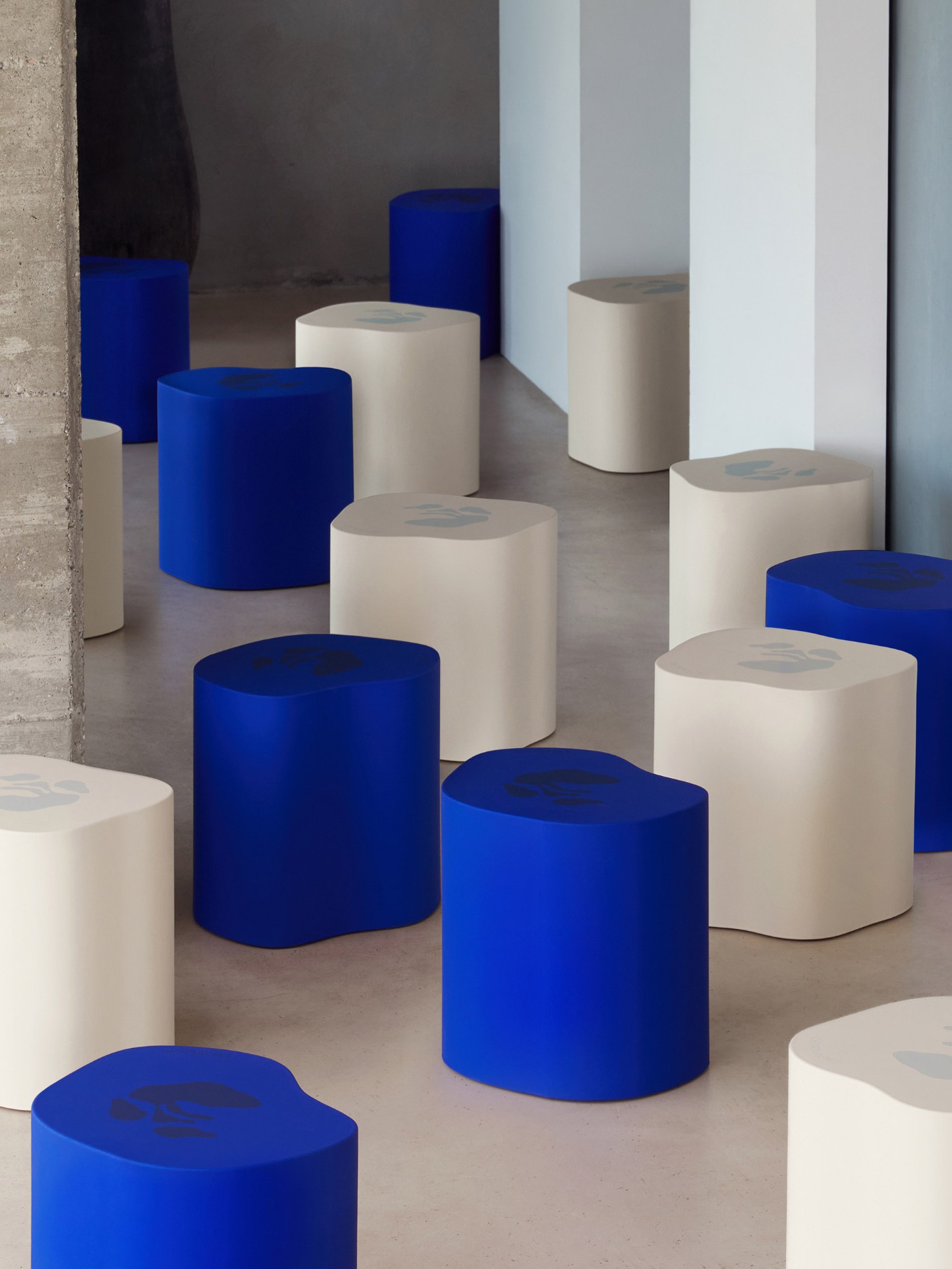 类似形状的无背凳以米白和蓝色双配色呈现,颇具简洁科幻的未来感。
