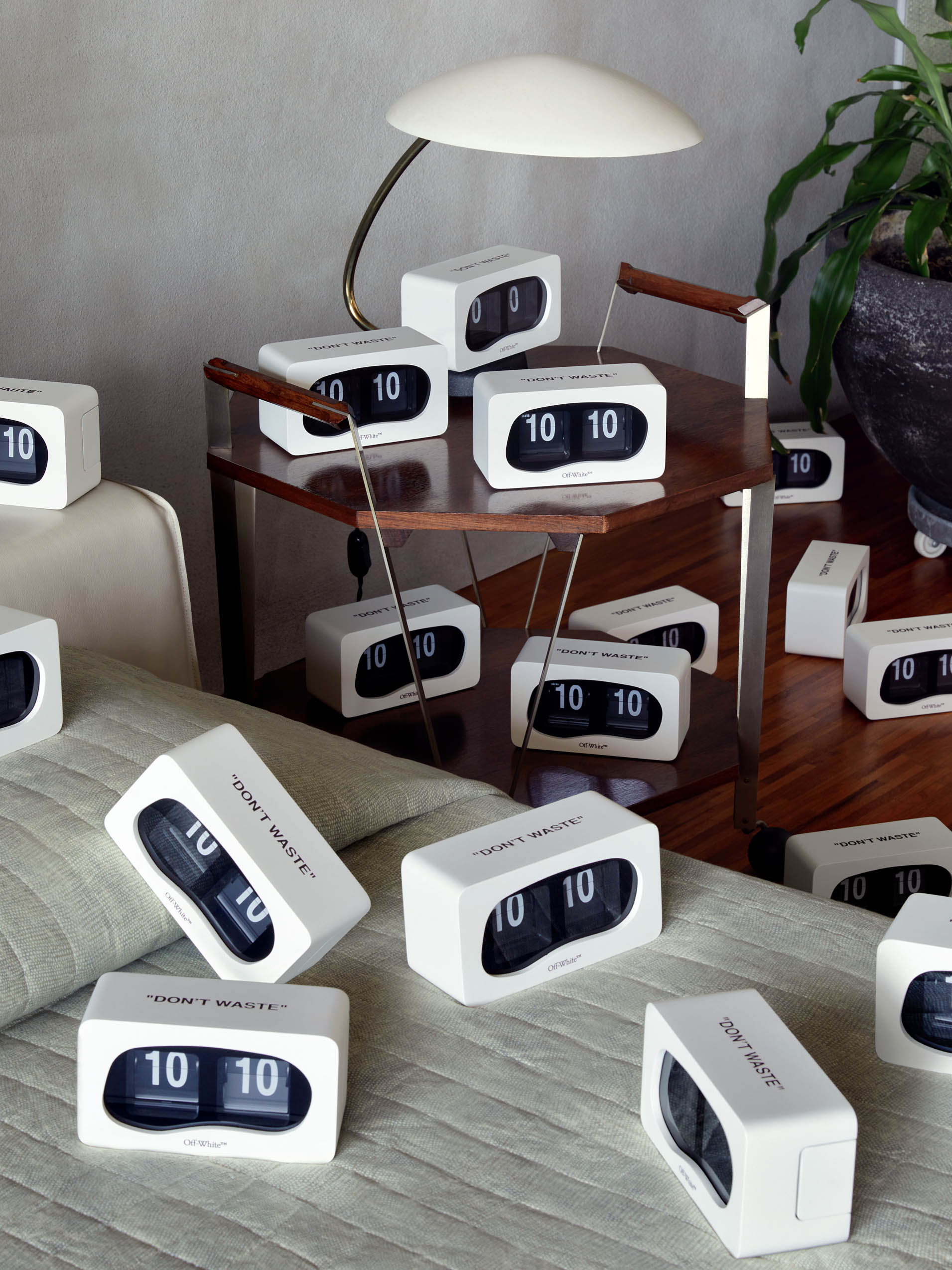 例如印有 “DON’T WASTE” 的桌⾯翻转时钟、不对称设计的透明玻璃烛台,以及三款釉⾯陶瓷花瓶。