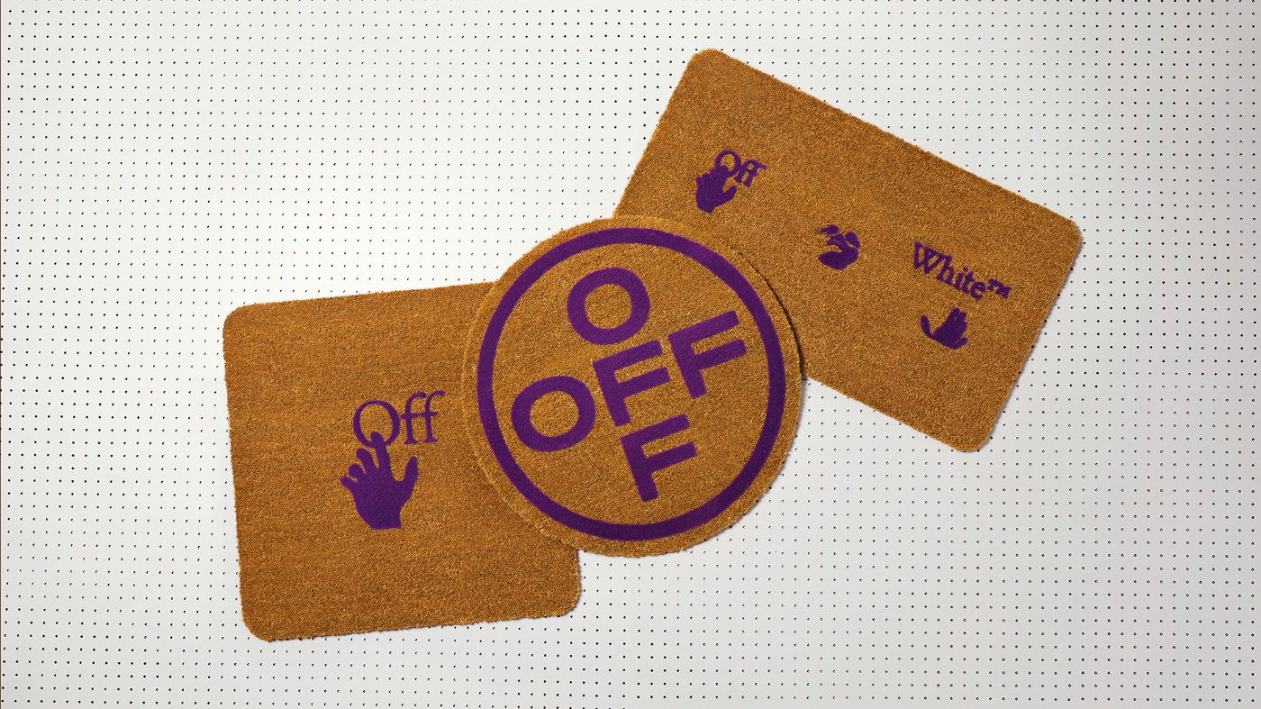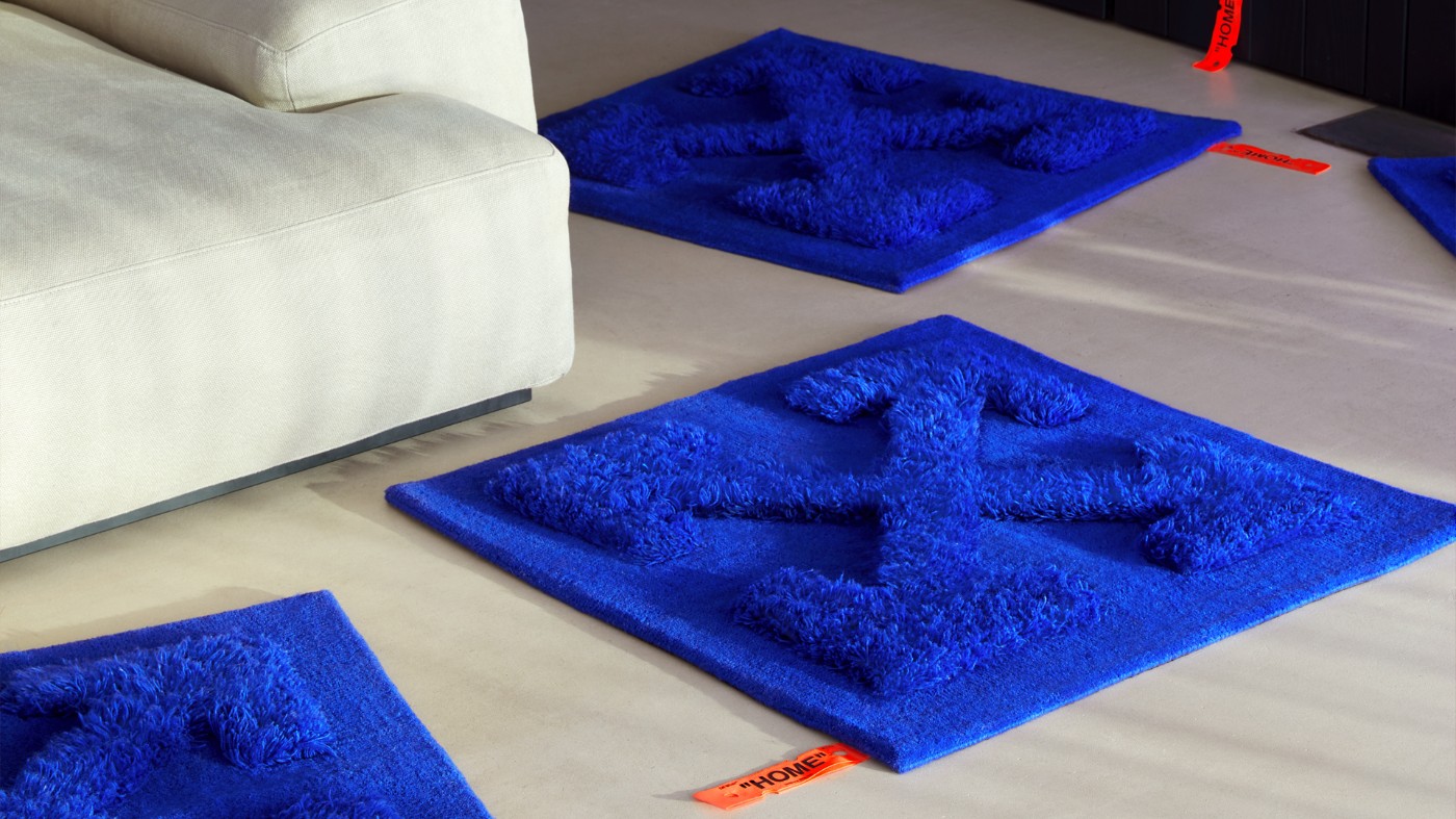 地垫产品包括用天然椰壳纤维打造的⻔垫,以及蓝色的⽺⽑地毯,硕大的箭头 Logo 让人一眼就认出是 OFF-WHITE 的产品。