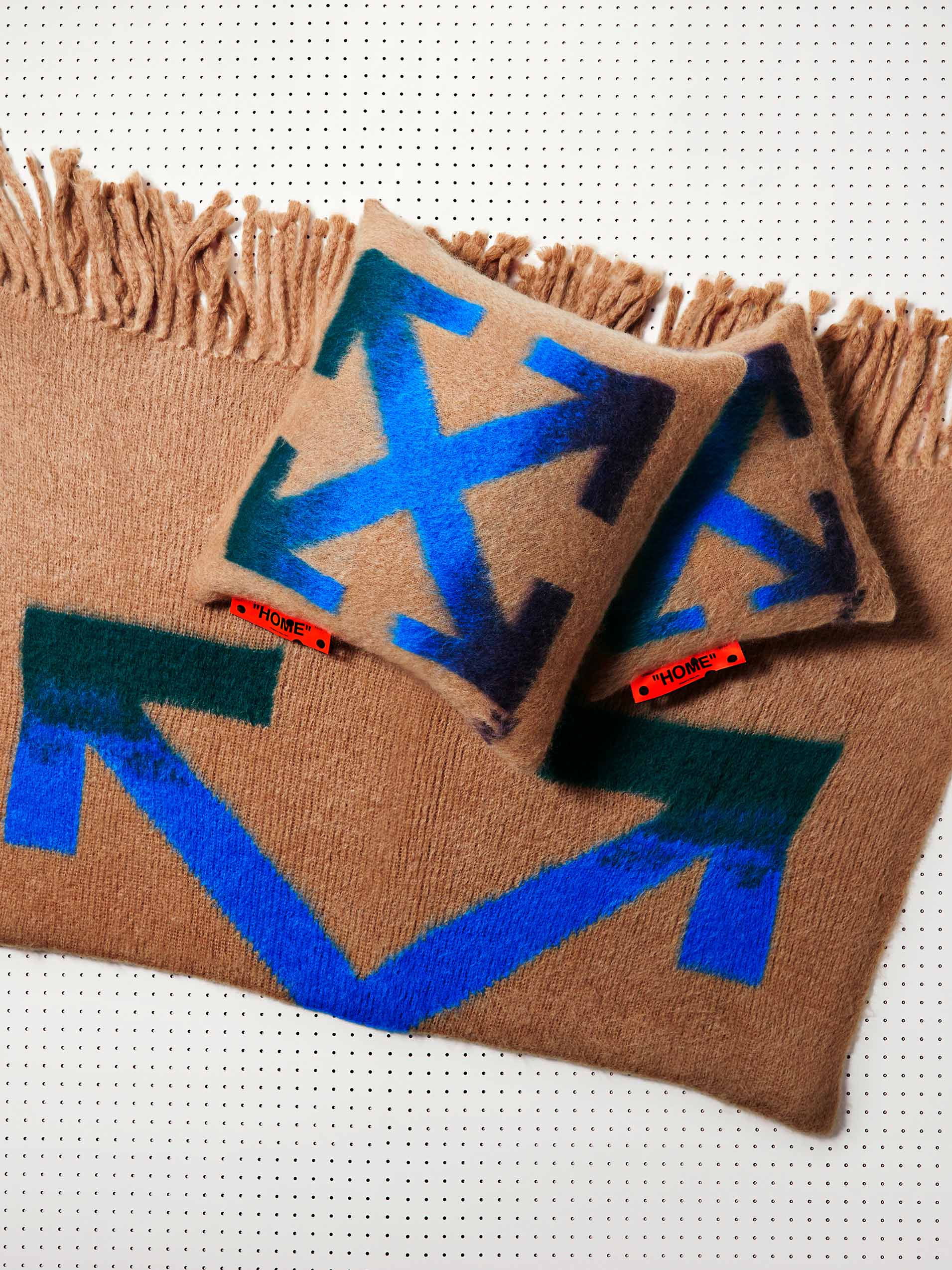 印有箭头 Logo 的棕褐⾊⽑毯与靠枕。