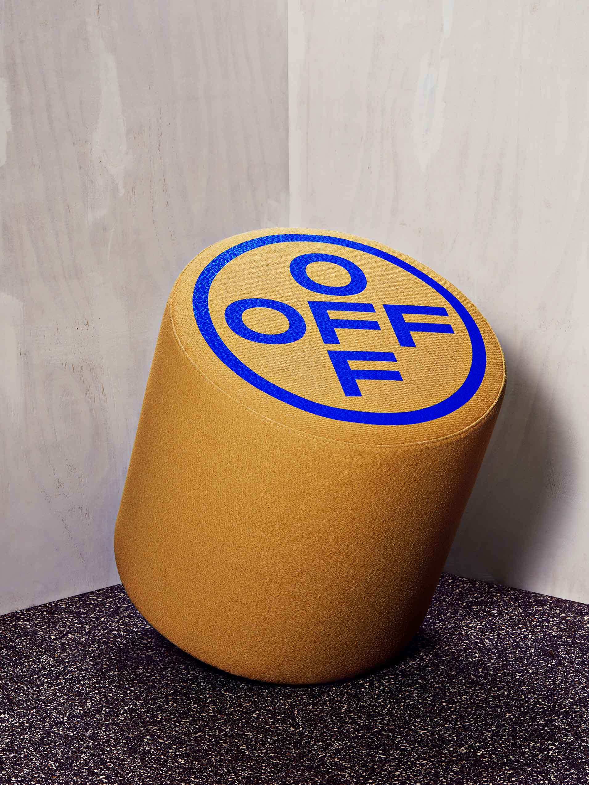 三款带有 OFF-WHITE 独家标志的地毯和无靠背座椅。
