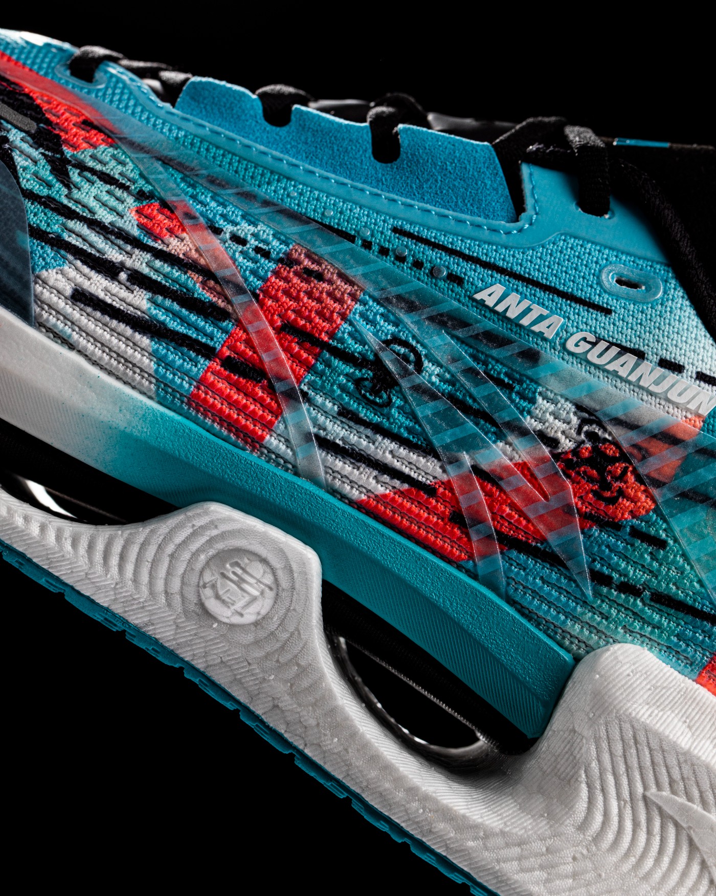 鞋面热塑压胶贯穿鞋头至后跟,灵感来源于跑车车身骨架,以安踏 Logo 为原点形成鞋面骨架式支撑结构,增强全鞋身的稳定性和支撑性。