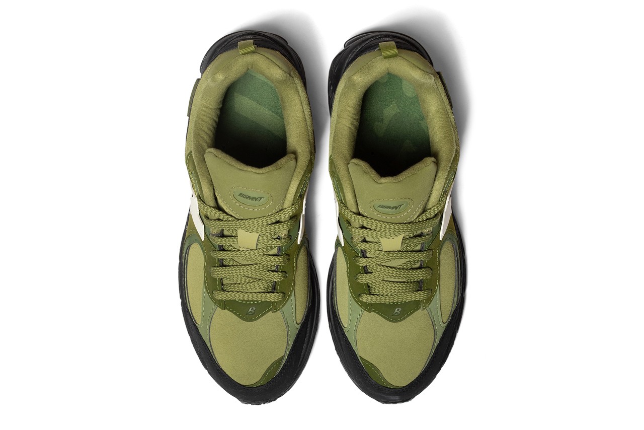 双方打造的联名鞋以橄榄绿色呈现,搭配黑色外底,带来极强的视觉冲击力。