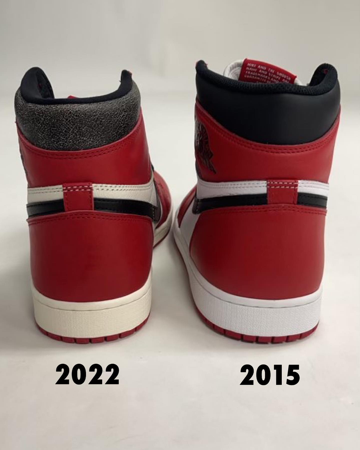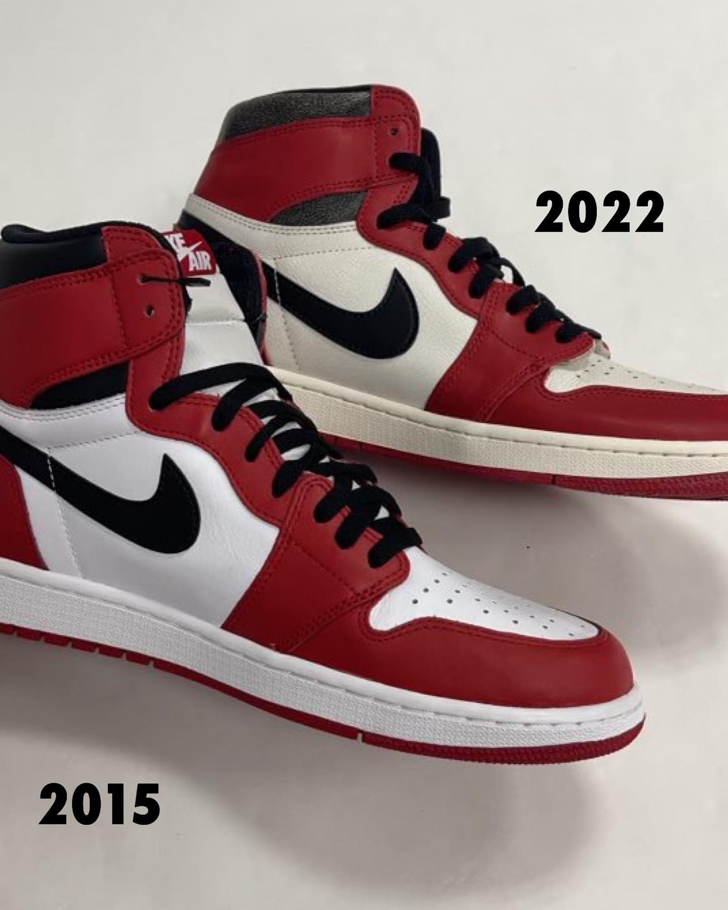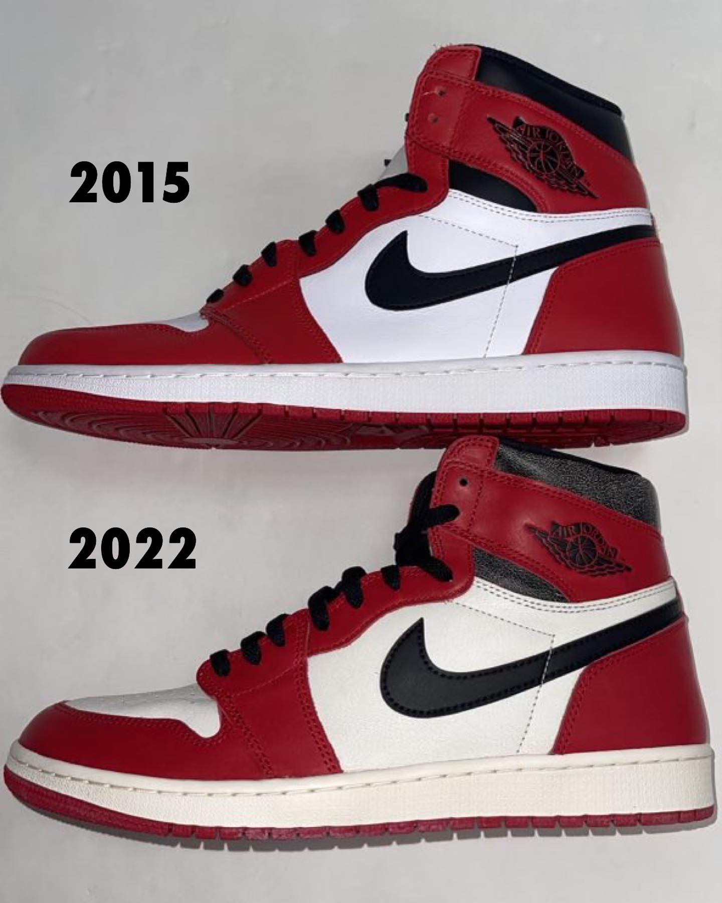 总的来说 2015 版鞋型更高更宽,颜色更鲜艳,2022 版鞋型更接近元年,色彩也更有年代感。