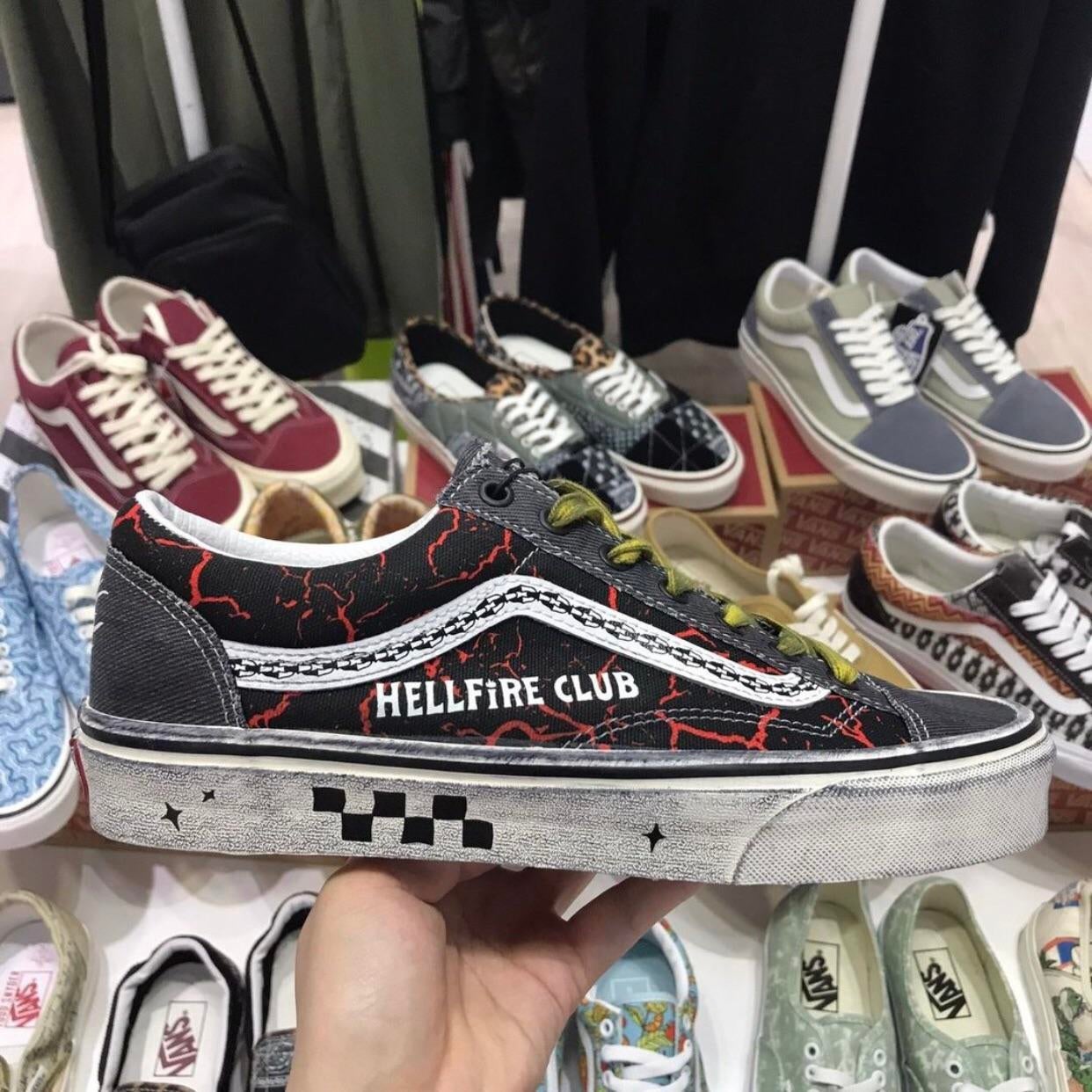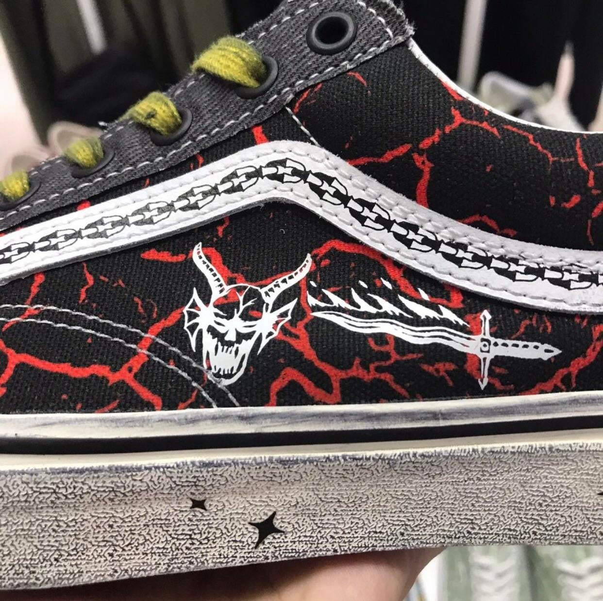 选用 Vans Old Skool 鞋型,配色灵感来自剧中主角团的 Hellfire Club T 恤。