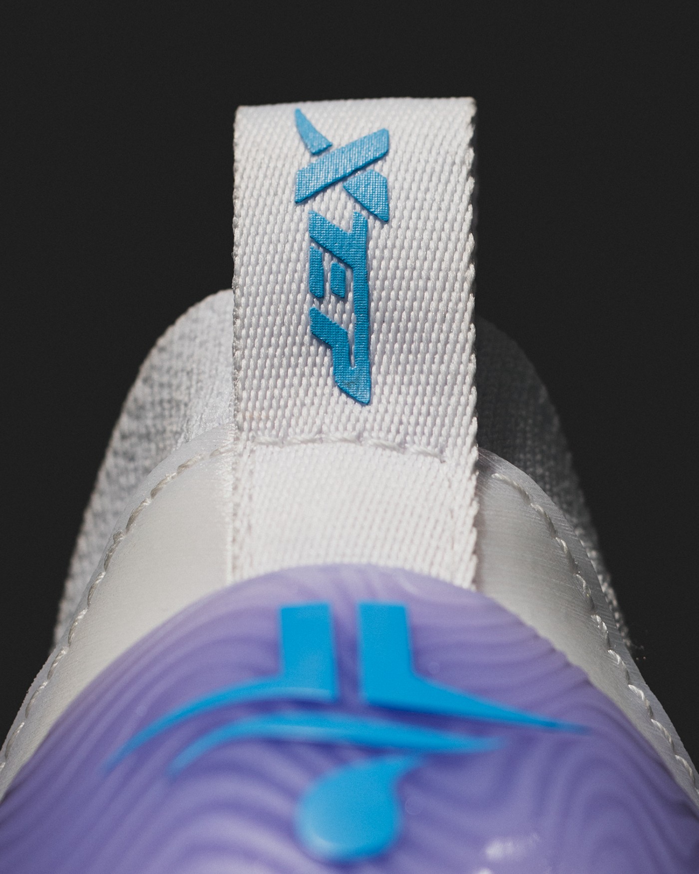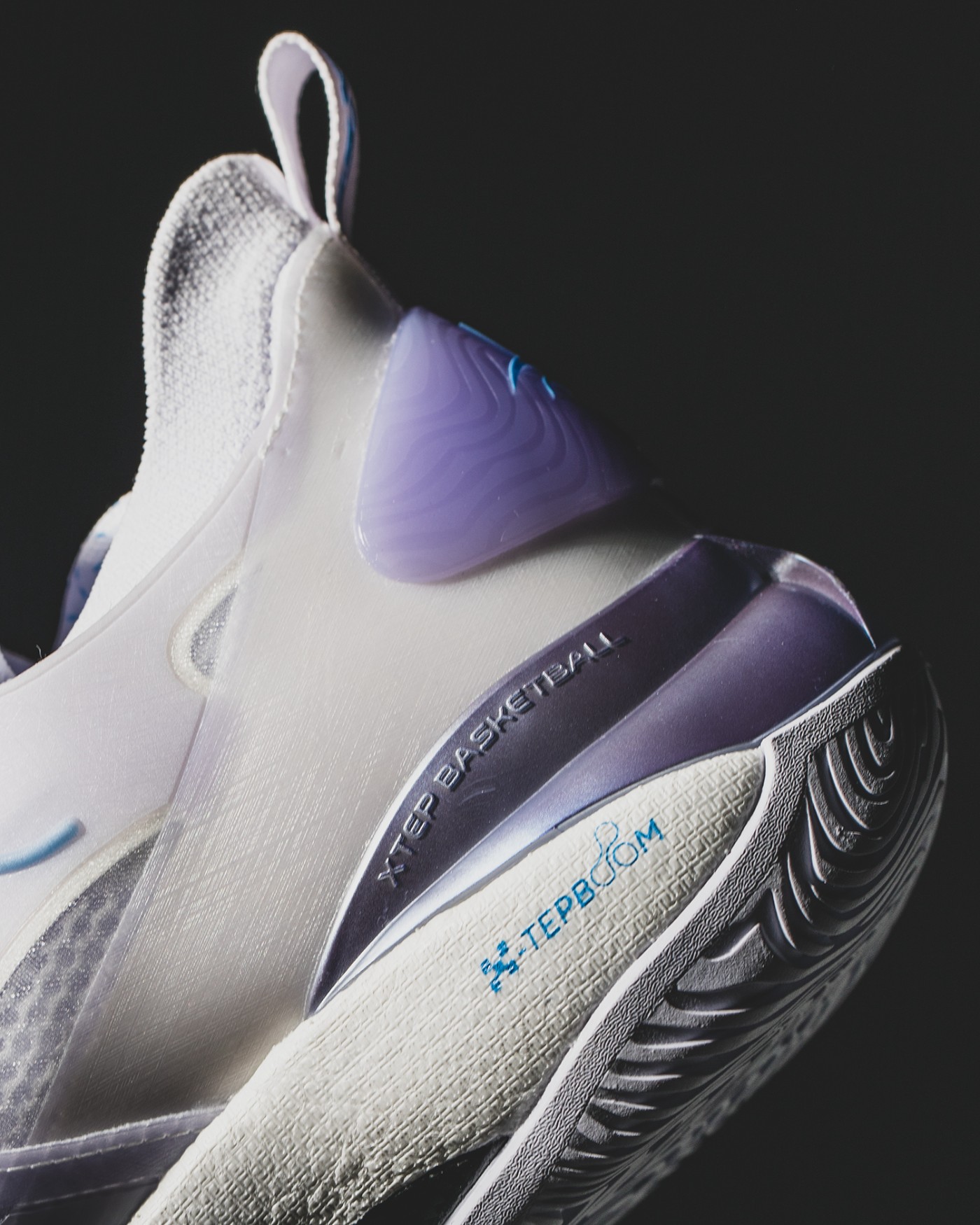 后跟位置一整块紫色 TPU 包裹上,可以看到超大的书豪 LOGO,整双鞋上也尽在鞋提以及外地可见特步 LOGO。
