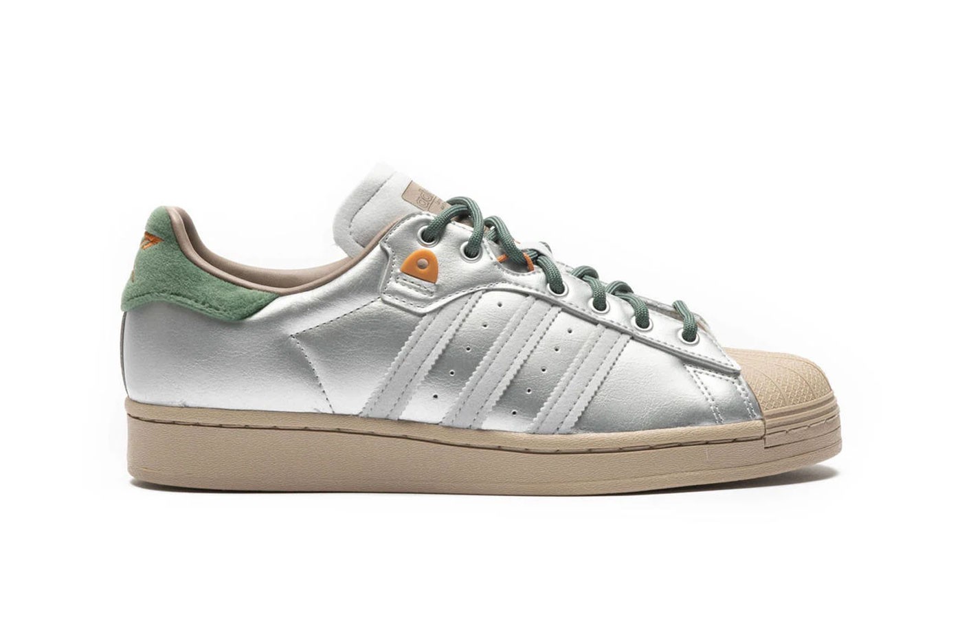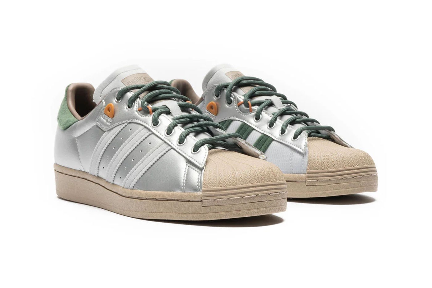 这次的联名鞋款也致敬了它的户外风格,选用三叶草最为经典的贝壳头 Superstar 鞋型。